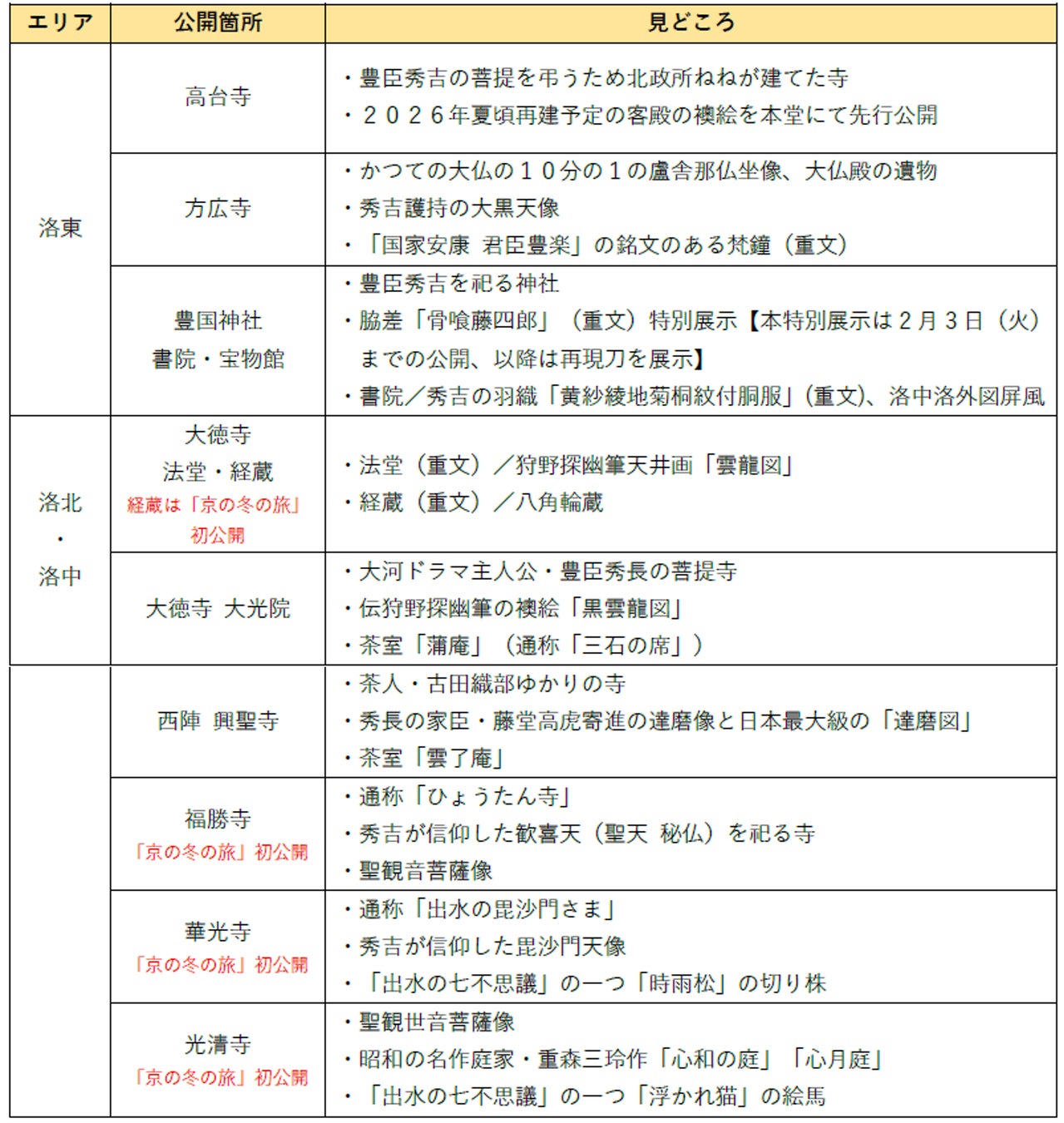 1967年1月に始まった本企画は、2026年に第60回を迎えます。今回は、大河ドラマ「豊臣兄弟!」の主人公・豊臣秀長と兄・秀吉ゆかりの地をテーマに、15件の貴重な非公開文化財を特別公開します。また、定期観光バスやタクシーで巡る特別コースのほか、京都の歴史や文化をより深く楽しめる体験プラン、60回記念の特別企画など、多彩で充実した内容で展開します。