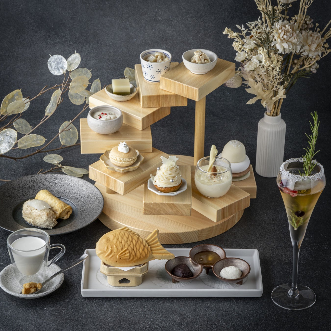 日本の冬の美しい白をイメージした、和のアフタヌーンティー。白餡を使用したまろやかな口当たりの「白餡と豆乳のモンブラン」や、風味豊かな「アーモンドミルクプリン」「ケールホワイトチョコ羊羹」など、令和本膳ならではの甘味。また「蓮根の白和え」「白い木ノ子のお浸し」などの和食店ならではのセイボリーも魅力です。
