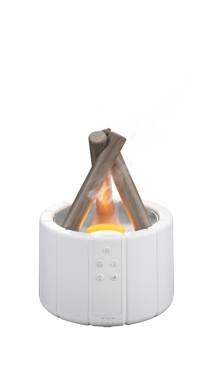 ミストがかがり火のようにゆらぎ、アロマディフューザーとしても使用可能。リモコン付き。