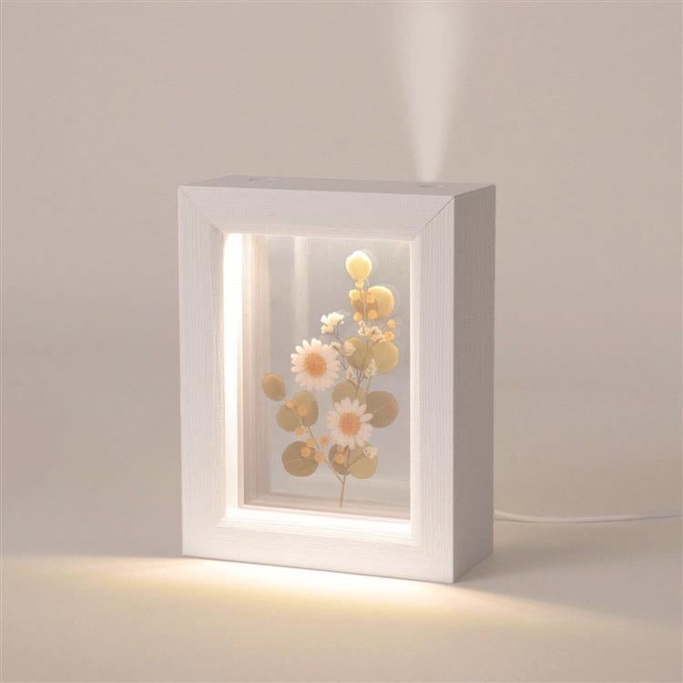 中心にドライフラワーのクリアカードが入っており、ライトが水に反射し優しく光るフレーム型の加湿器。