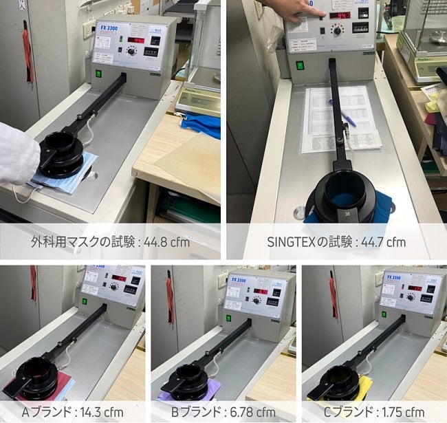 サージカルマスク並みの通気性能 44.7cfm(立方フィート毎分)を達成しました。