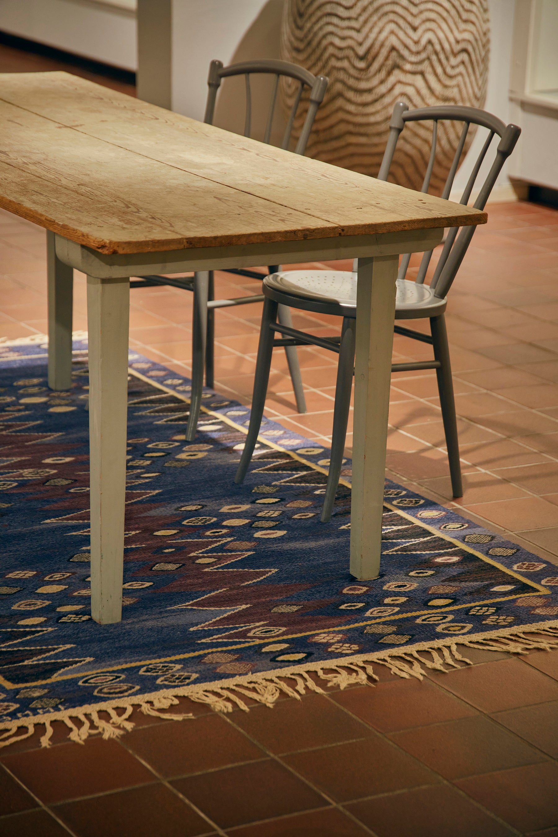 1920年代頃から確立されていったモダニズムの潮流は、伝統的な織物技術を芸術の域へと高めました。マルタ・モース=フィエッターストローム(Märta Måås-Fjetterström 1873-1941)は、手工芸協会の創設者、リリィ・ジッケルマンとともにモダンなデザインの開発などに携わったのち、1919年、スコーネ地方、ボースタッドに自身の織物工房〔MMF工房〕を開き、バーブロ・ニルソン(Barbro Nilsson 1899-1983)、マリアンヌ・リヒター(Marianne Richter 1916-2010)ら、優れた織り手を集めてラグを制作しました。