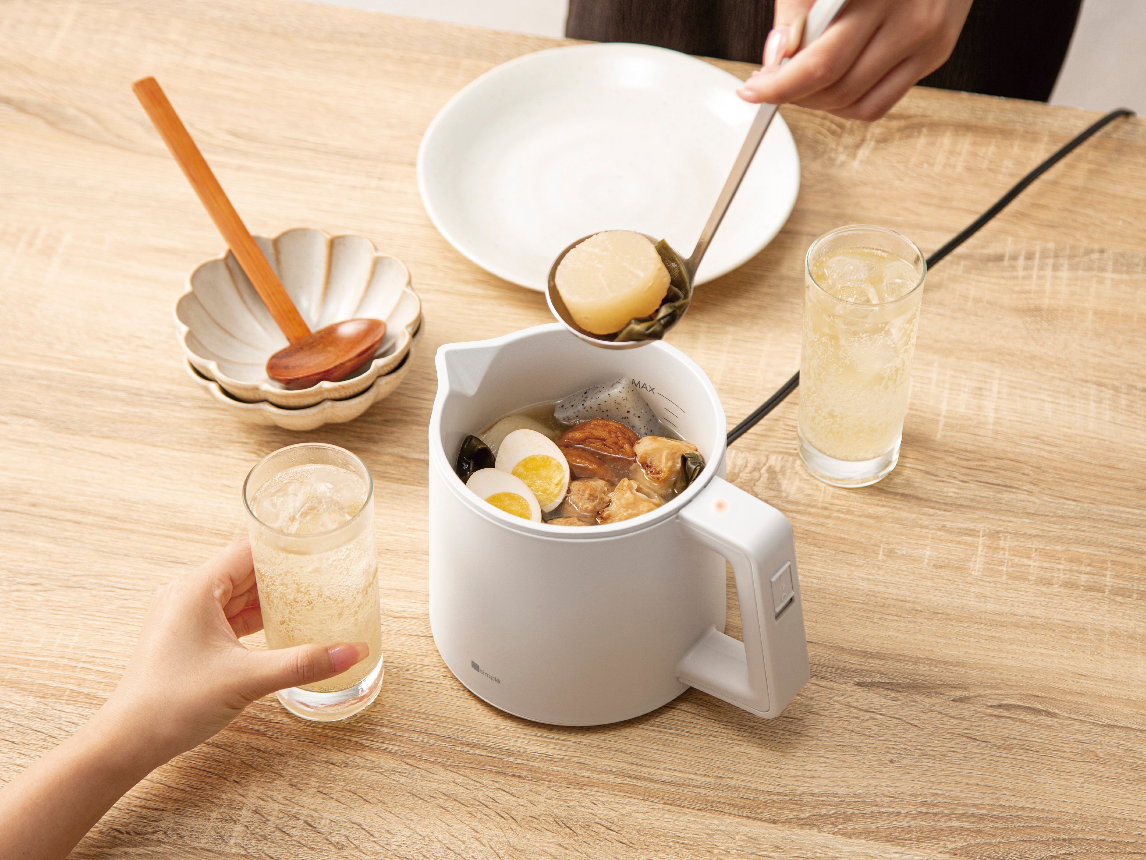 この度、「1台3役の電気ケトルポット」が「1台5役おてがる調理ポット」に進化して新登場! 毎日の調理の幅が広がり、より便利になりました。