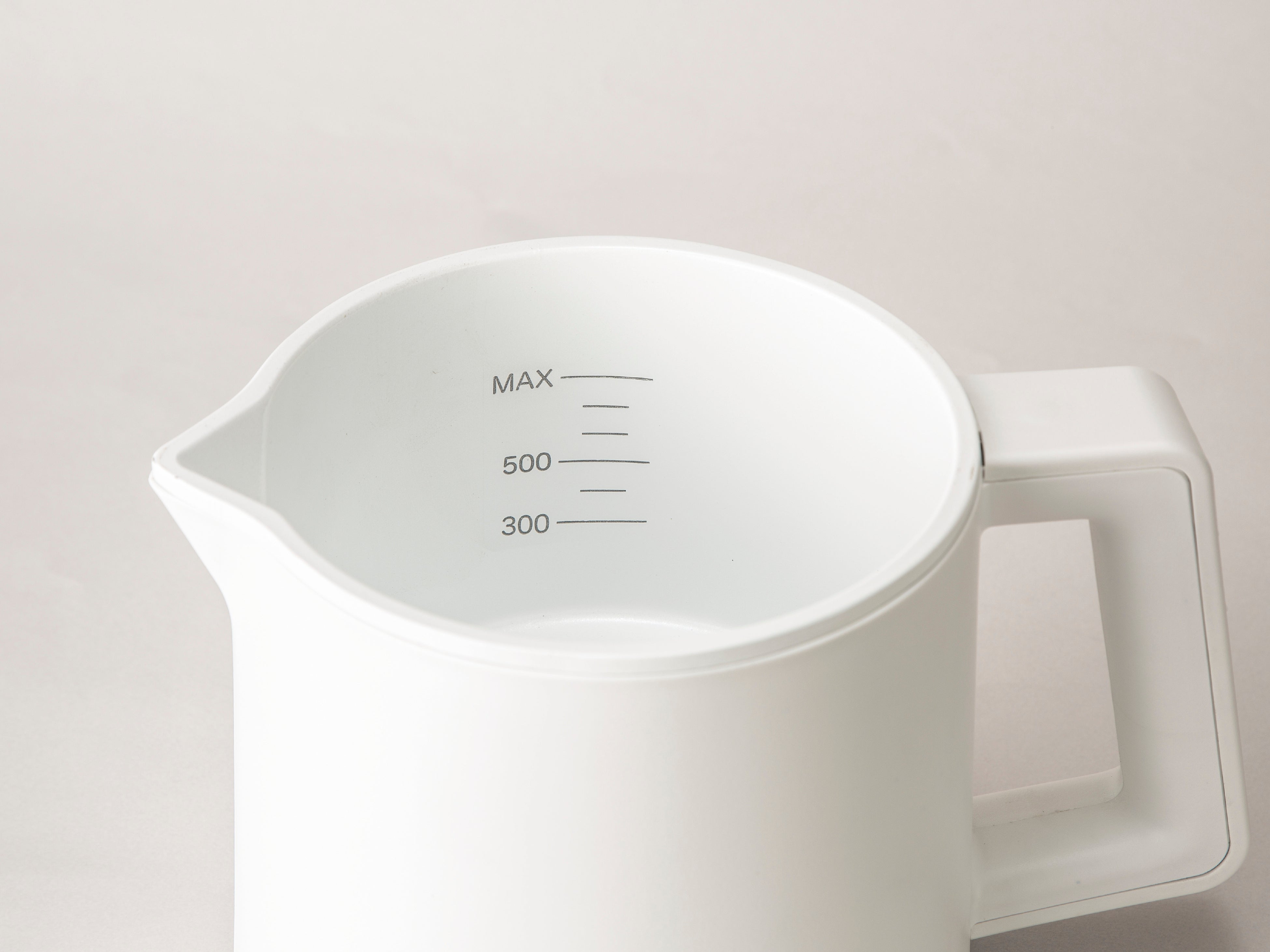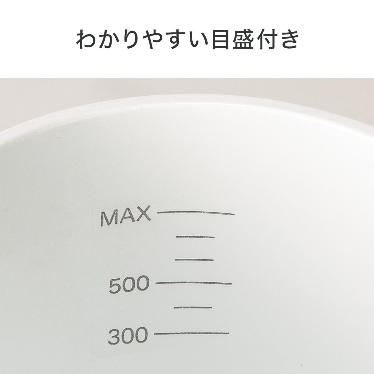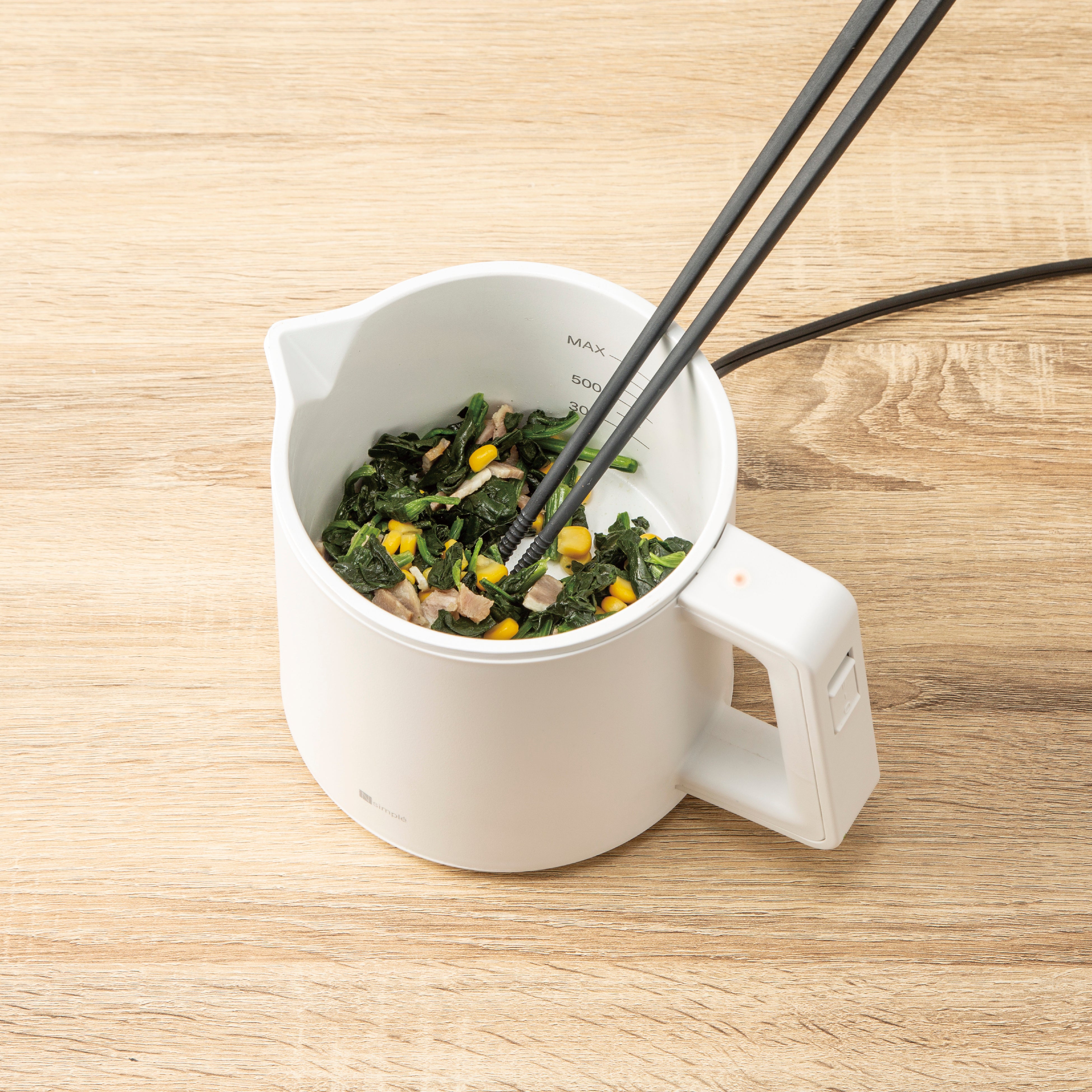 容器内側には300mL~800mLまで100mL単位で目盛りがついており、計量カップで水の量を計る必要がありません。ふたには大小の湯切り穴がついているので、パスタや野菜を茹でた後にざるを用意する必要もありません。洗い物を増やさずに調理できます。