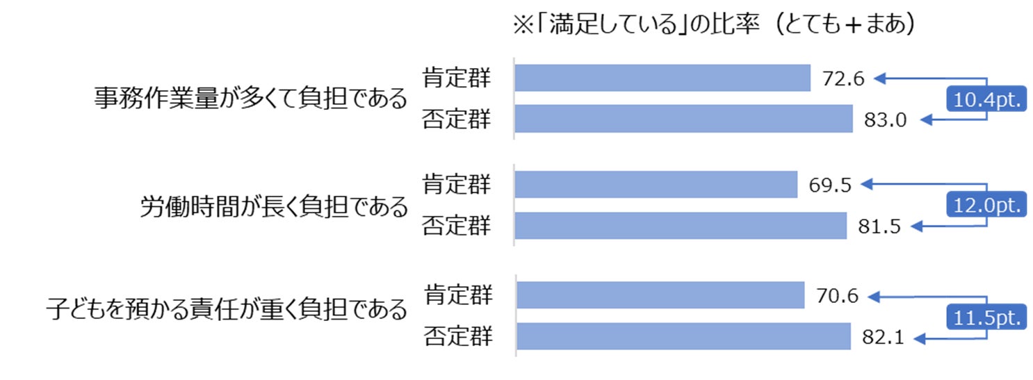 事務作業量の多さ、長時間労働、子どもを預かる責任の重さといった負担感が少ない保育者は、そうでない保育者と比べて仕事満足感が10ポイント以上高い。