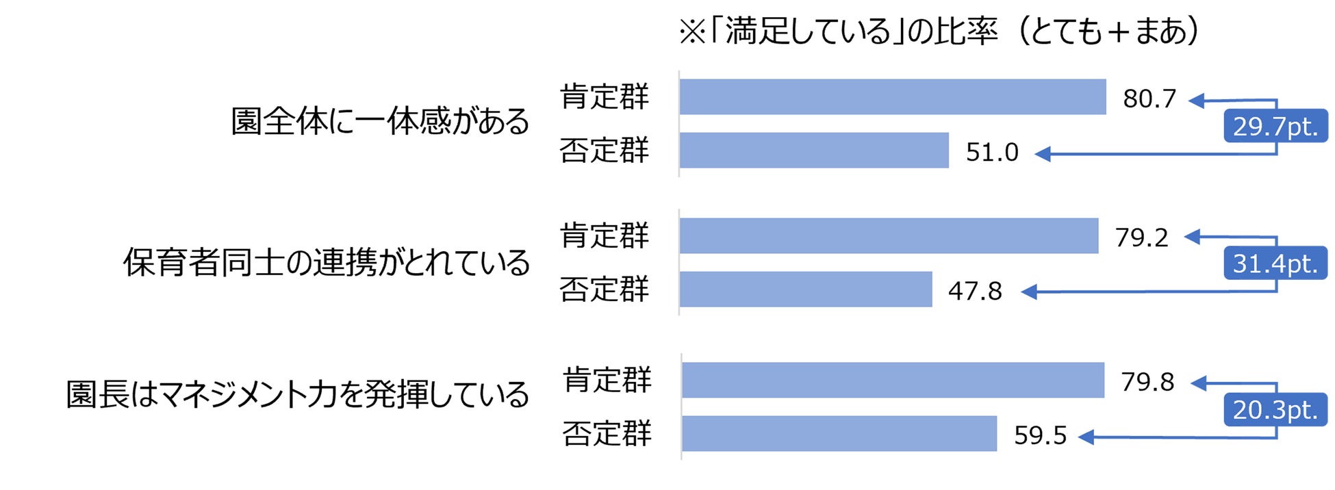 園全体に一体感がある、保育者同士の連携がとれている、園長がマネジメント力を発揮していると感じている保育者は、そうでない保育者と比べて仕事満足感が約20~30ポイント高い。