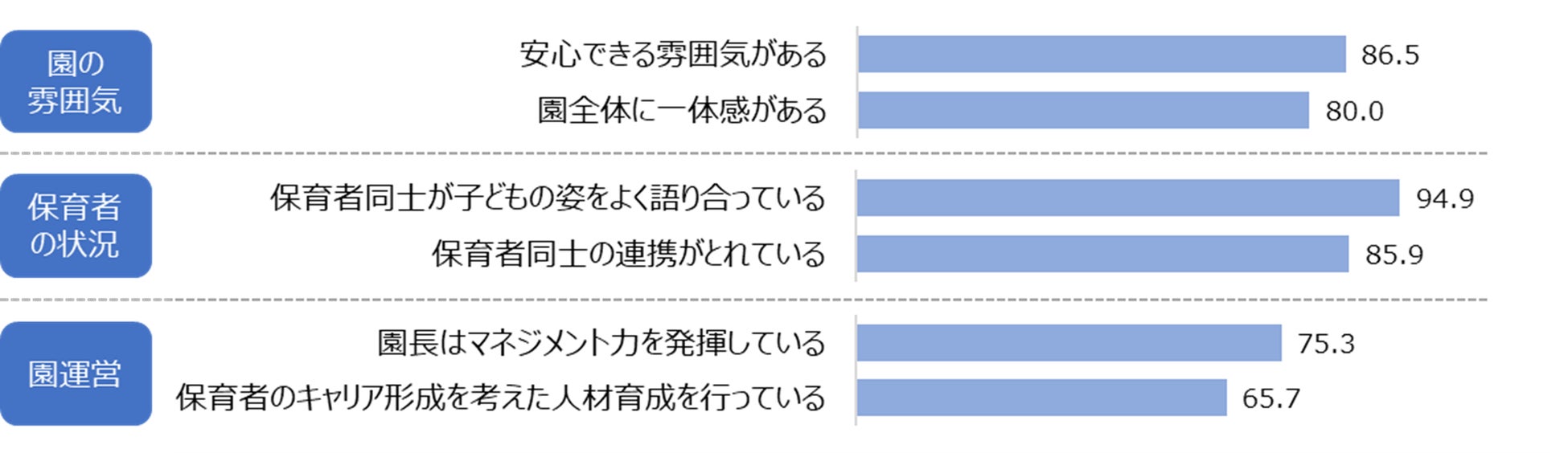 94.9%が「保育者同士が子どもの姿をよく語り合っている」、86.5%が「安心できる雰囲気がある」、75.3%が「園長はマネジメント力を発揮している」、65.7%が「保育者のキャリア形成を考えた人材育成を行っている」と回答。