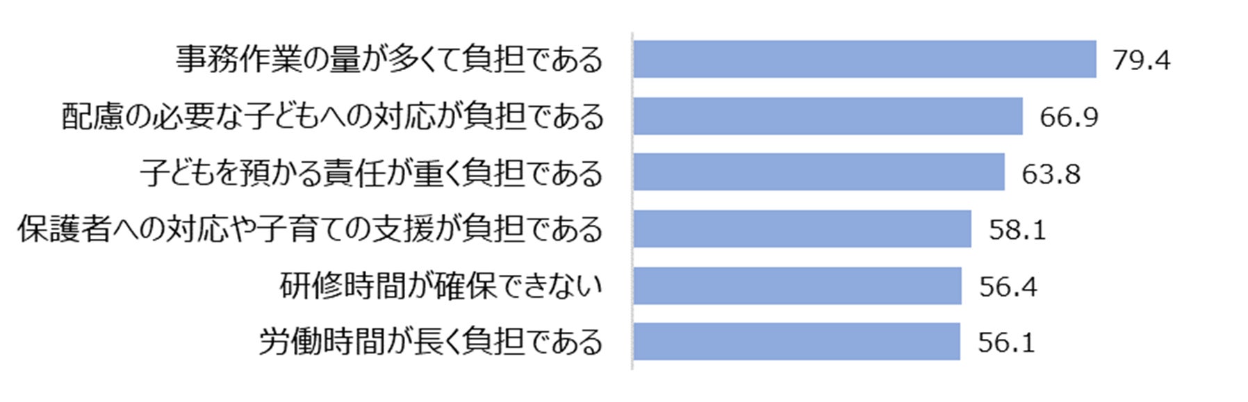 79.4%が「事務作業の量が多くて負担」、66.9%が「配慮の必要な子どもへの対応が負担」、63.8%が「子どもを預かる責任が重く負担」、56.4%が「研修時間が確保できない」と回答。