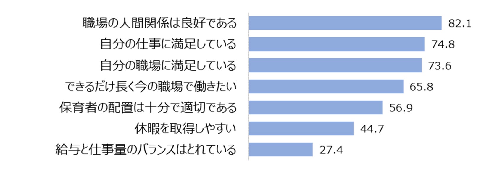 保育者の82.1%が「職場の人間関係は良好」、74.8%が「自分の仕事に満足」、73.6%が「自分の職場に満足」と回答。 一方、「給与と仕事量のバランスはとれている」と肯定した回答者は27.4%にとどまる。