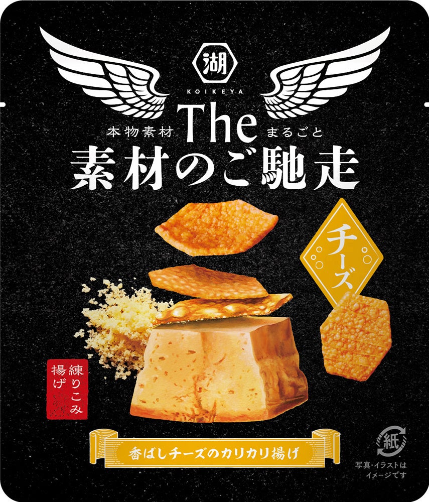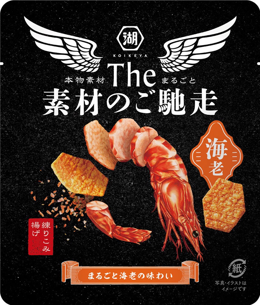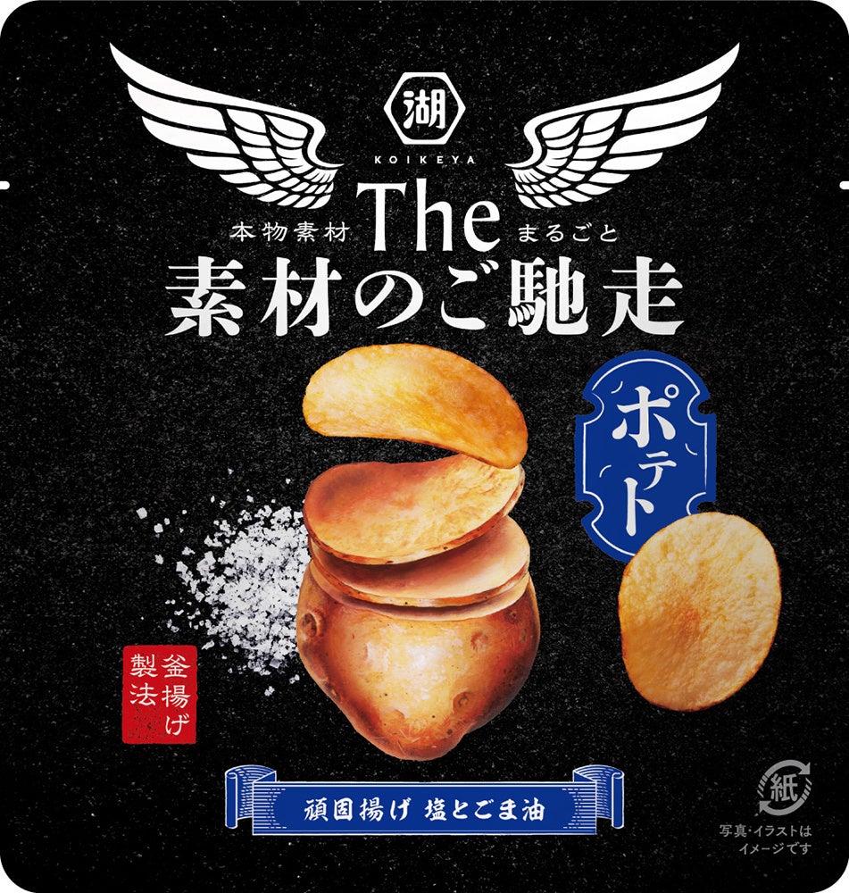 「The 素材のご馳走」は、現行の「The KOIKEYA」でご評価いただいている“珍味のような素材感”というハードの強みを活かし、ポテト/海老/チーズの3品ともに“素材の旨み”が存分に堪能できる味わいに仕上げています。パッケージでも、黒をベースとして高級感・上質感を演出しつつ、素材からチップスに変化している特徴的なデザインを中央に配置し、“素材の旨み”がそのままチップスに詰まっていることを表現しています。さらに、「紙」を使ったパッケージを使用することで、品質感を加えるとともに、プラスチック削減を目指した環境配慮型の商品にもなっています。