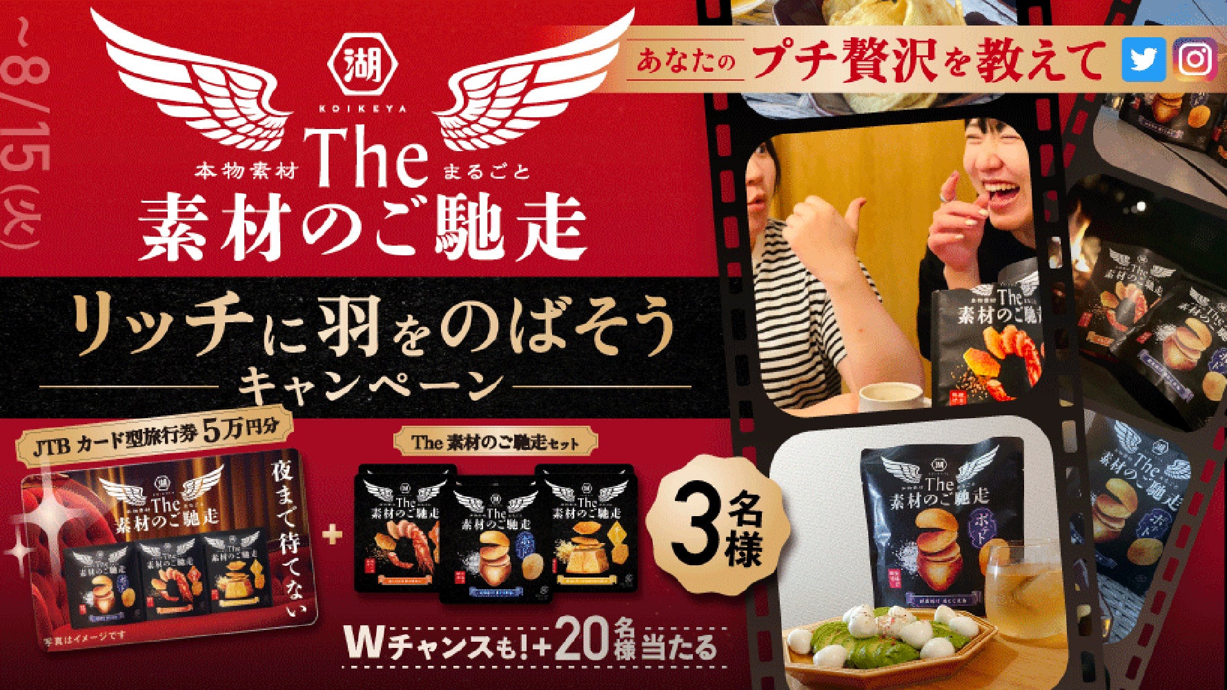 新ブランド「The 素材のご馳走」の発売を記念して、SNSでのコメント投稿キャンペーンを実施します。今回のキャンペーンは、「The 素材のご馳走」を食べるシーンとしてもぴったりな、“あなたのプチ贅沢”を、【#The素材のご馳走】【#プチ贅沢】の2つのハッシュタグとともにご投稿いただくと応募完了。当選者様には、贅沢に「JTBカード型旅行券5万円分」、「The 素材のご馳走 各2袋」のセットなどをプレゼントします。豪華商品を当てて、リッチに羽をのばしましょう!