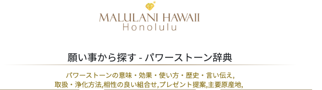 15年以上の歴史を持つ、ハワイ発パワーストーンジュエリーブランド、マルラニハワイより新サイトオープンのお知らせです。パワーストーンの意味・効果・使い方・歴史・言い伝え,取扱・浄化方法,相性の良い組合せ,プレゼント提案,主要原産地などパワーストーンの情報を網羅したパワーストーン辞典のページを新設いたしました。