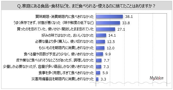 【食品ロスに関する調査】まだ食べられる食品・食材を捨てた場面は、「賞味・消費期限内に食べきれなかった」「状態が悪くなった」が各30%台。フードシェアリングサービスの利用意向は4割弱