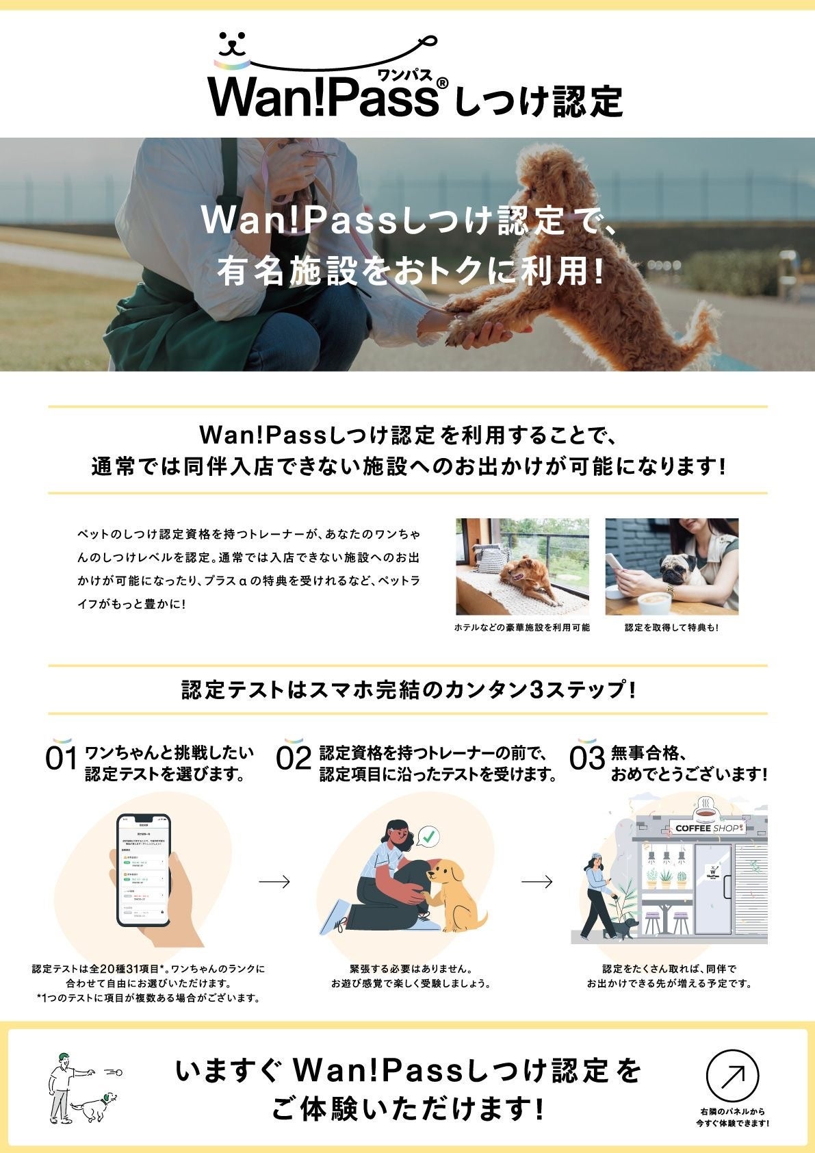 プロのドッグトレーナーによるグループレッスンを体験後、その場でWan!Passしつけ認定試験に挑戦していただけます。perromartカップ 「オスワリ」選手権に参加した後、チャレンジするのがオススメです!愛犬と一緒にぜひご参加ください!