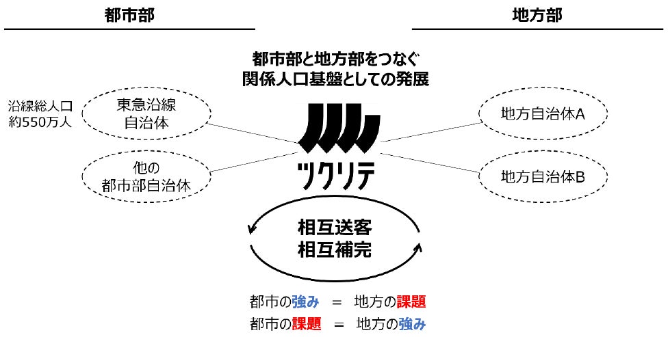 する仕組みを構築することで、都市部と地方部をつなぐ「関係人口」の創出を目指します。総務省が「ふるさと住民登録制度」の推進を図る中、当社は「ツクリテ」を通じて、「都市の強み」で「地方の課題」を解決し、「地方の強み」で「都市の課題」を補完する、双方向の送客や機能補完を実現します。都市・地方双方が「お互いさま」の関係で支え合える社会の構築に寄与していきます。