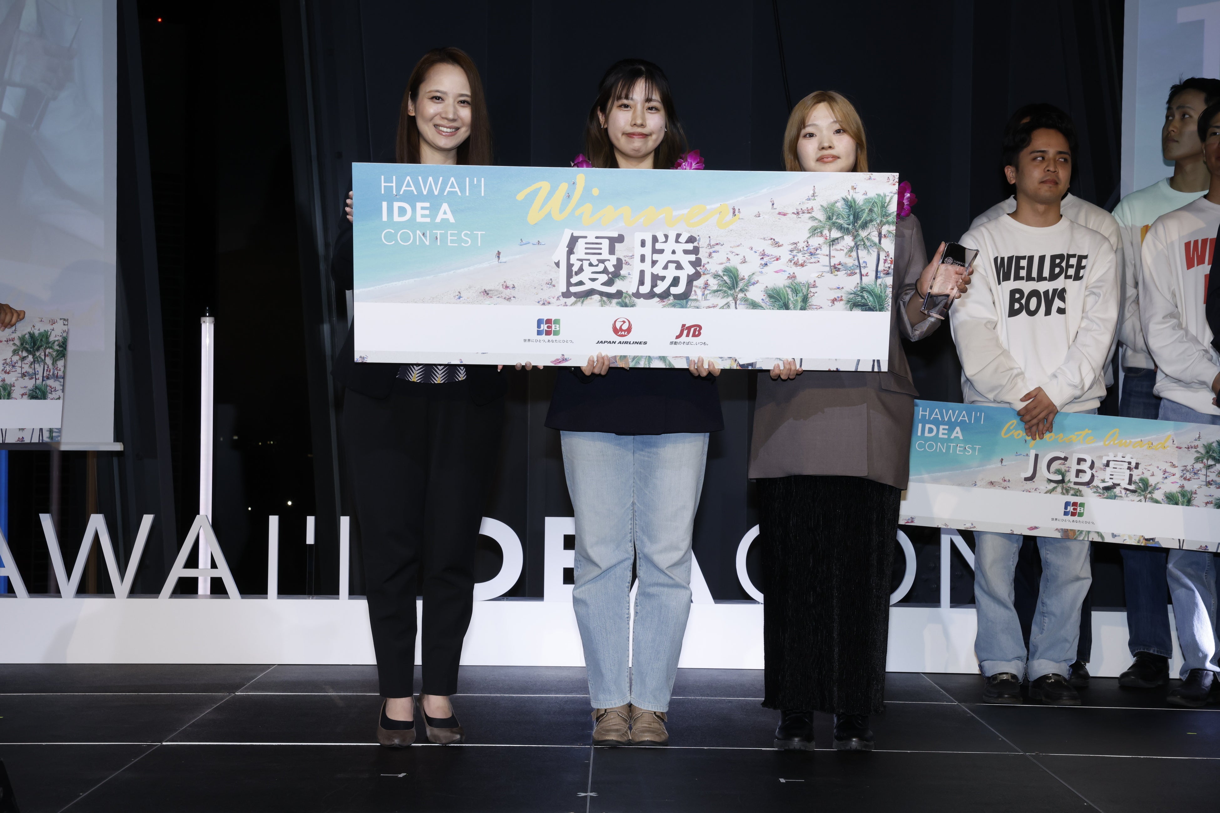 受賞したチームには、賞金100万円とハワイ旅行の招待、そしてJCB・JAL・JTBの3社とともに“次のハワイ旅”を共同で企画する権利が贈られました。メンバーは「まさか過ぎて、緊張しています。一緒にハワイに行って楽しんできます!」と優勝への喜びや、「自分がそうだった様に、誰かに対して海外旅行を前向きに捉えるきっかけをつくりたい」と、今後への想いを語りました。