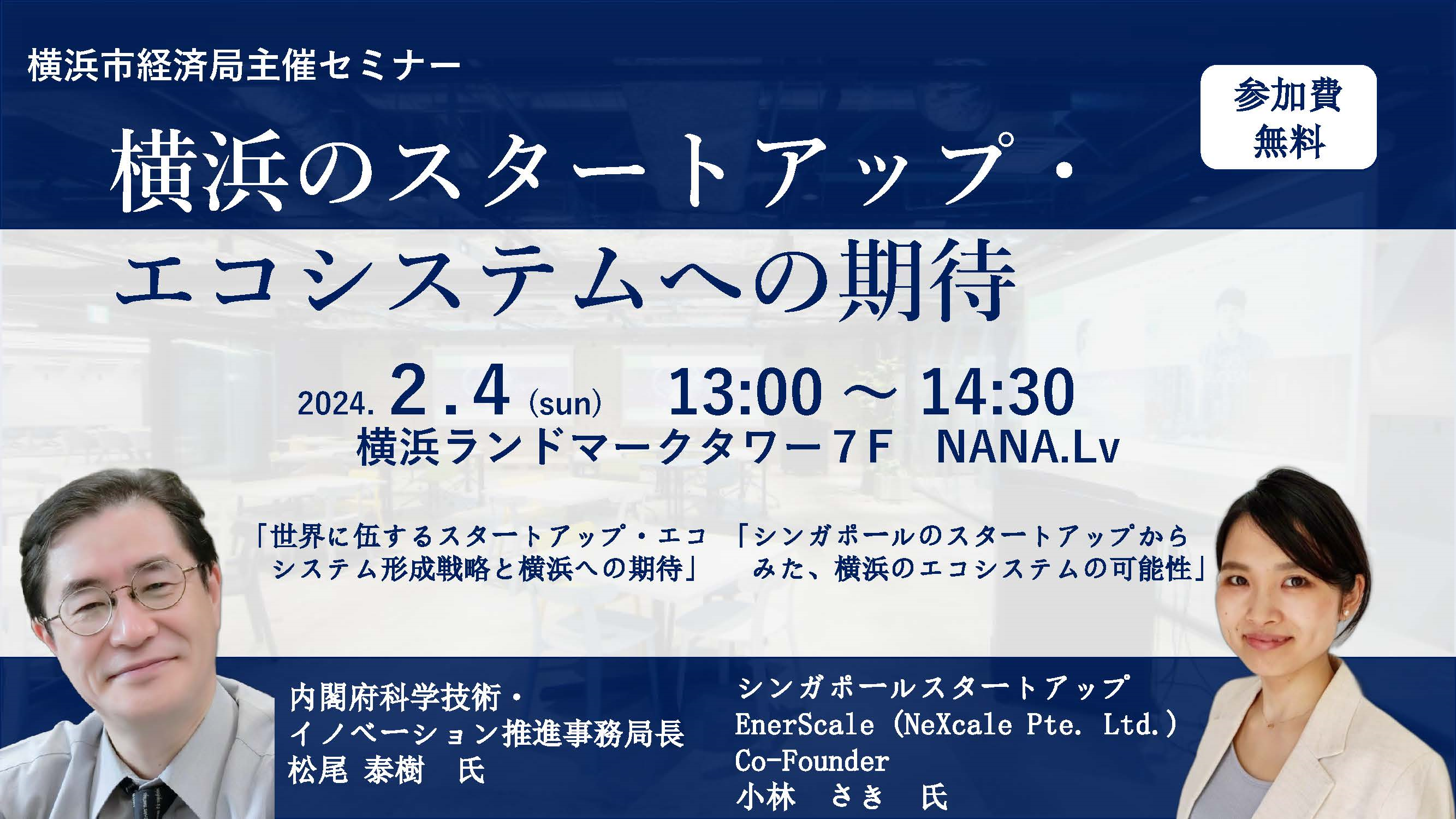 横浜市は国内外から人・企業・投資を呼び込むエコシステム構築に向け、スタートアップやイノベーションの創出を推進しています。内閣府科学技術・イノベーション推進事務局長松尾泰樹氏、シンガポールの起業家小林さき氏にご登壇いただき、国内外の先進事例をもとに横浜の可能性を探ります。