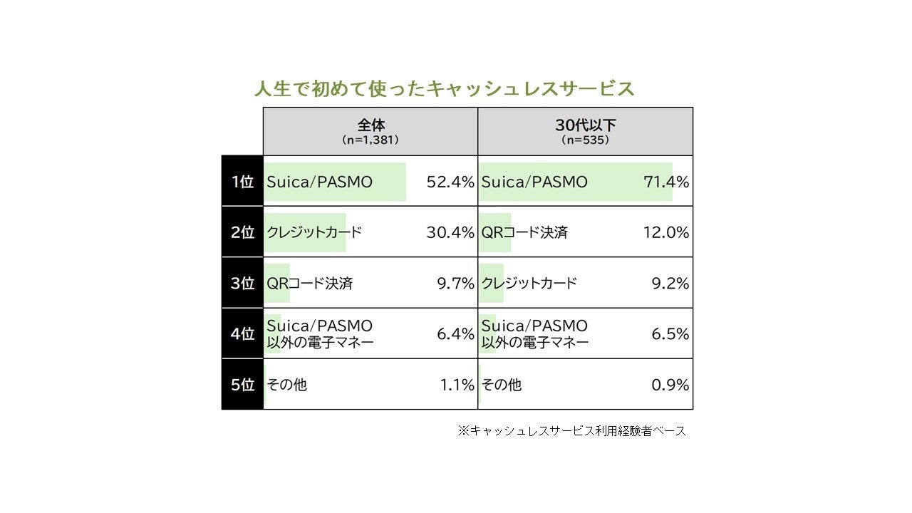 キャッシュレス利用経験者における人生初利用キャッシュレスは、Suica/PASMOがトップ