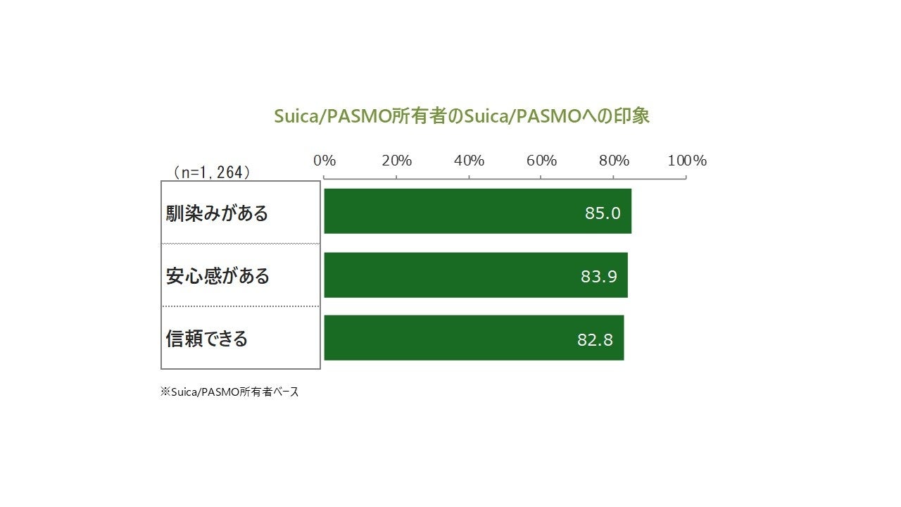 一都三県の生活者におけるSuica/PASMO所有者は84.3%と高い所有率になっています。また、所有者の8割以上がSuica/PASMOブランドに対して、馴染みや安心感、信頼感を抱いています。