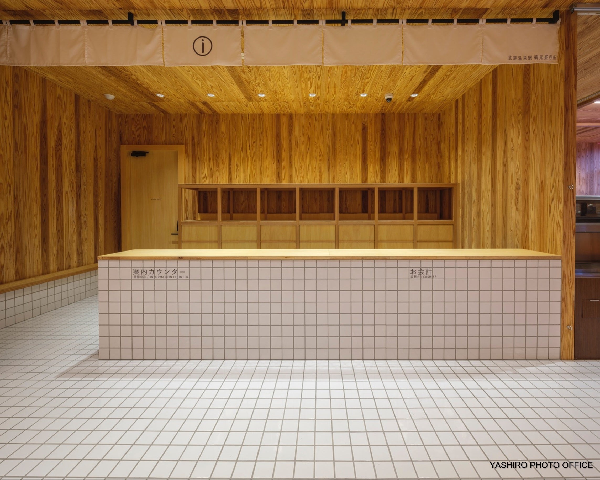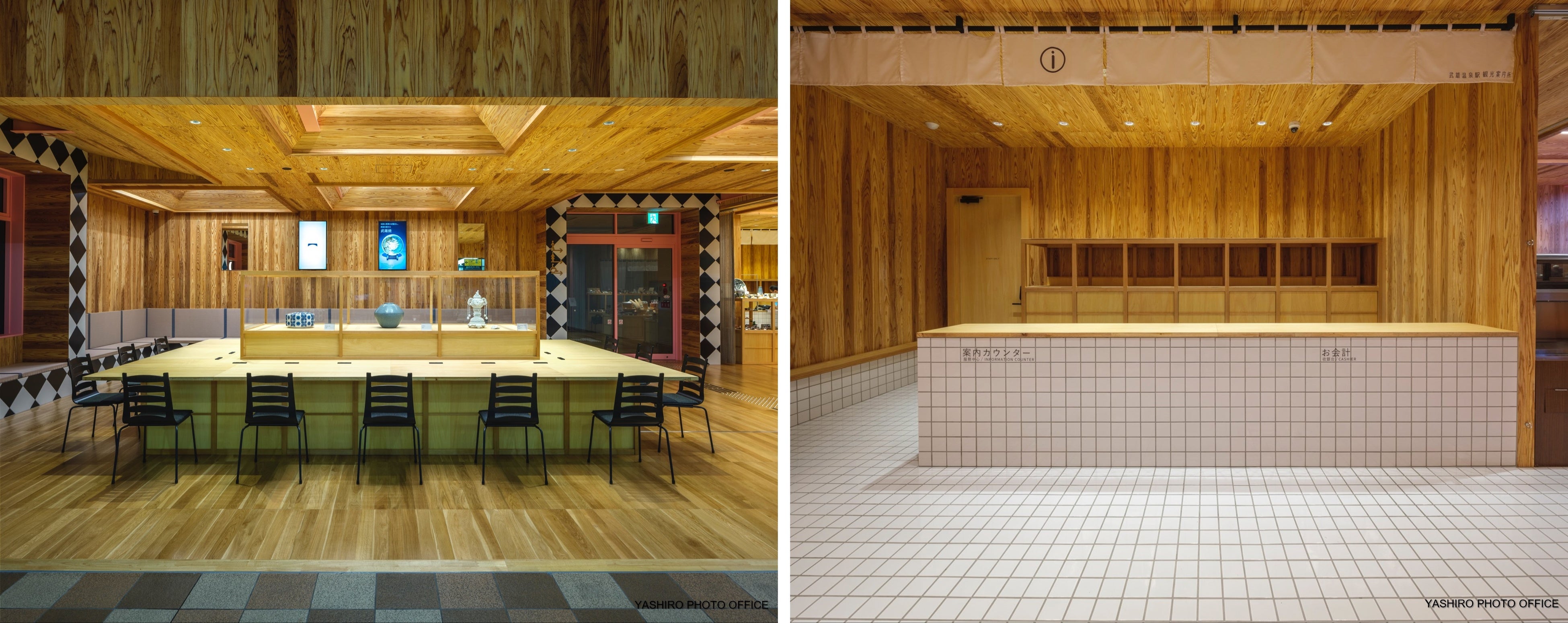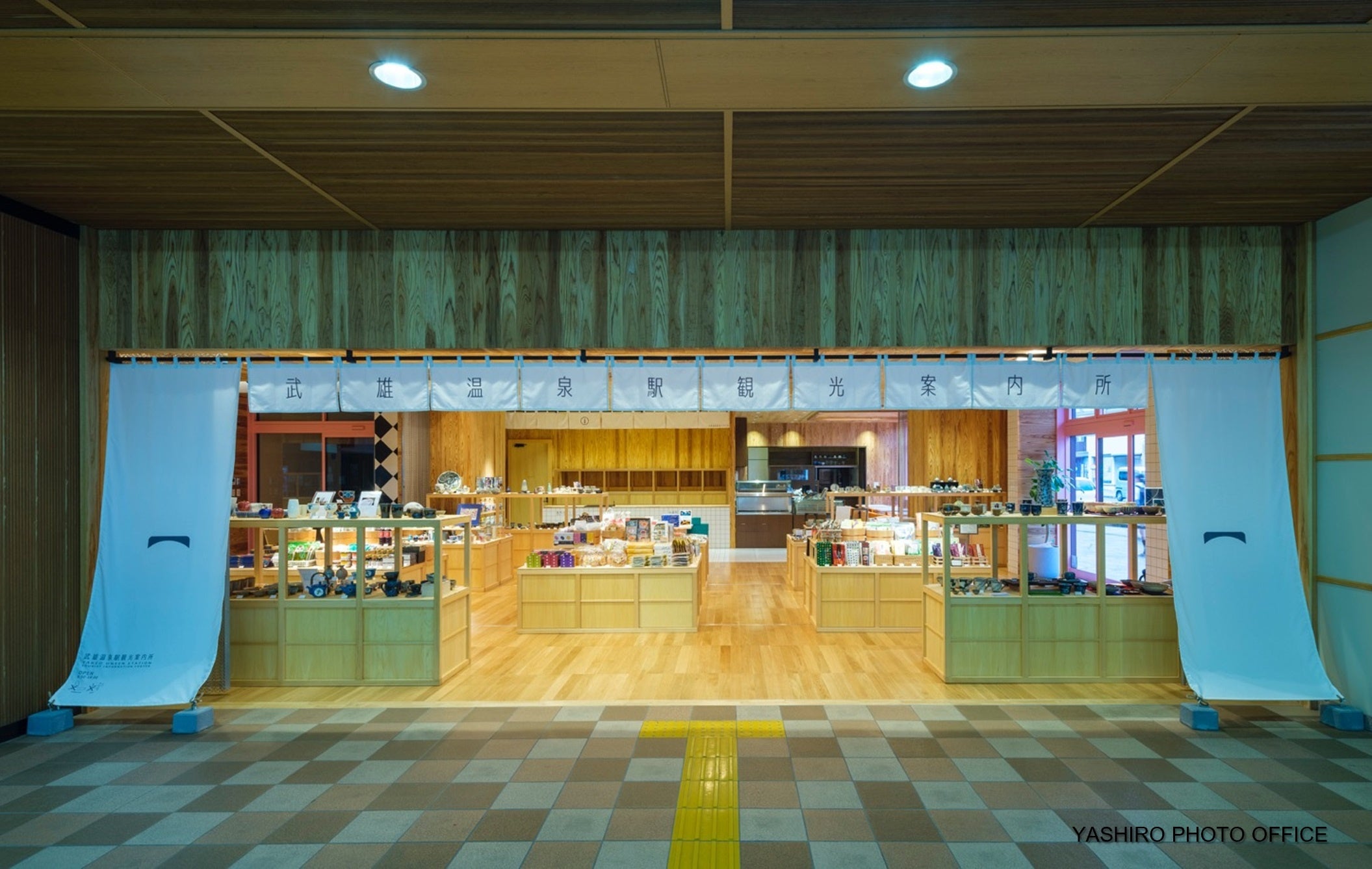 「武雄温泉駅観光案内所」は、入口の暖簾をくぐると、江戸時代中期、領主・武雄鍋島氏の専用風呂として造られた総大理石の見事な風呂「武雄温泉 殿様湯」の市松模様を継承したデザインの内装に、風呂桶などを活用して商品を並べるなど、温泉の街である武雄市の窓口として、観光客の皆様をお迎えいたします。