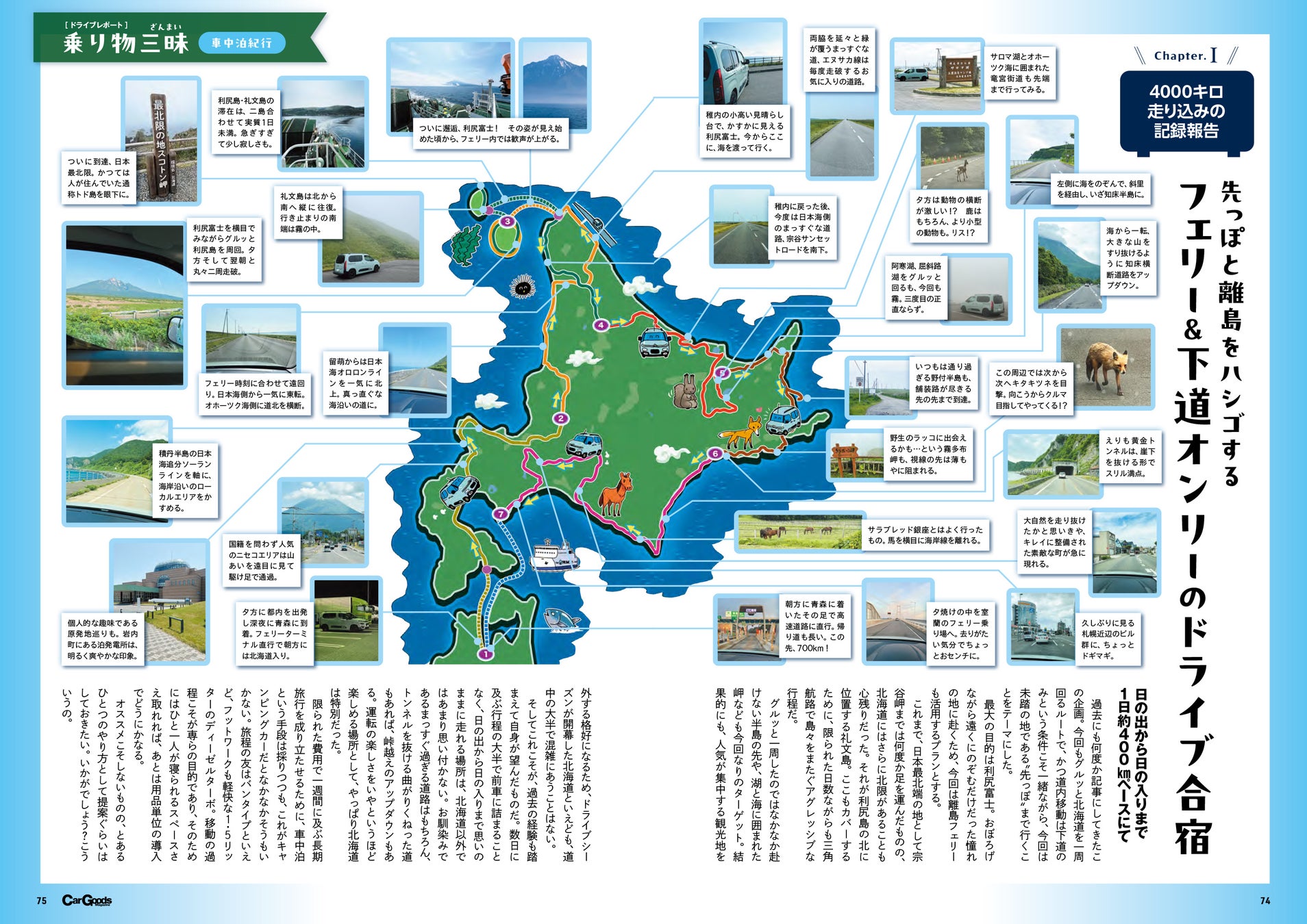 誌面後半では、夏休み発売号恒例のドライブ企画を2つお届け。ひとつ目は七泊八日・北海道車中&フェリー内泊の旅を実録レポート。