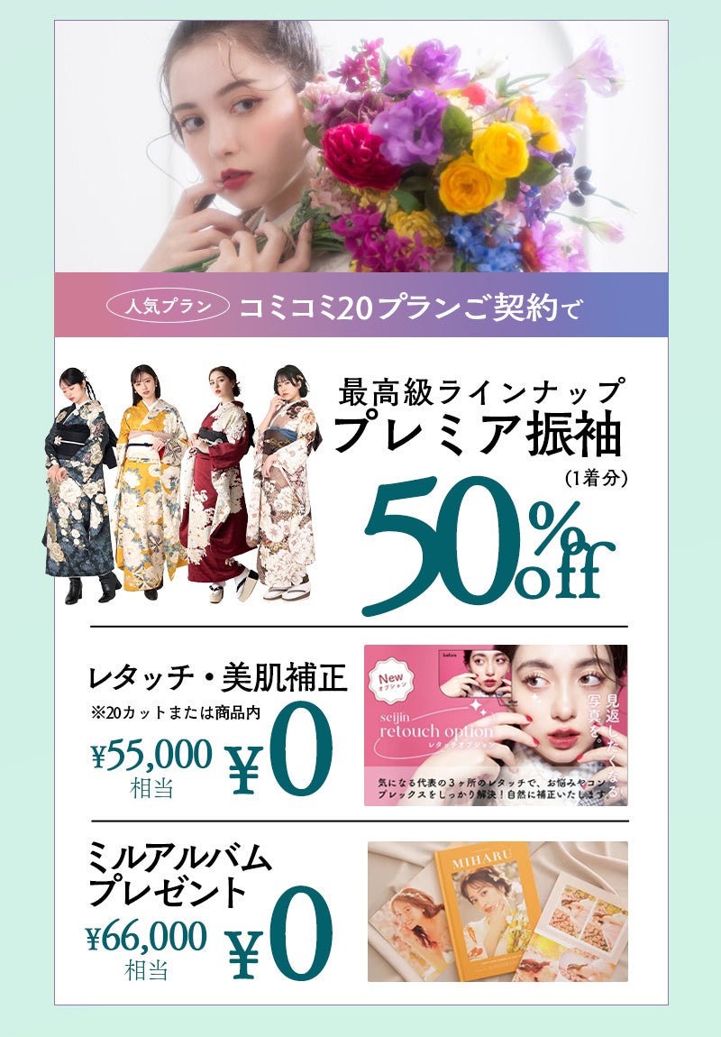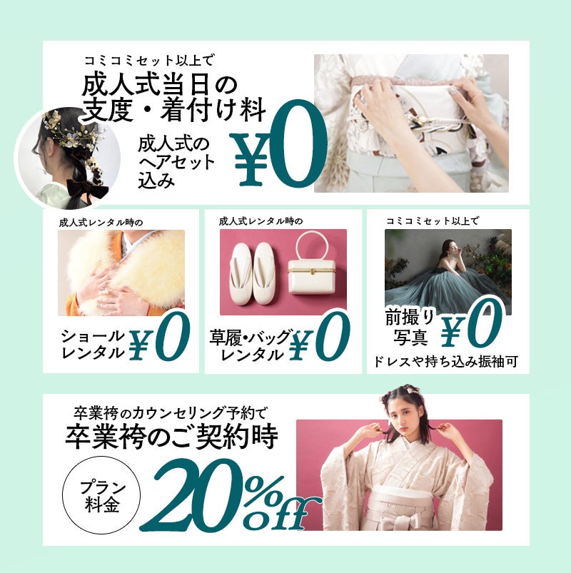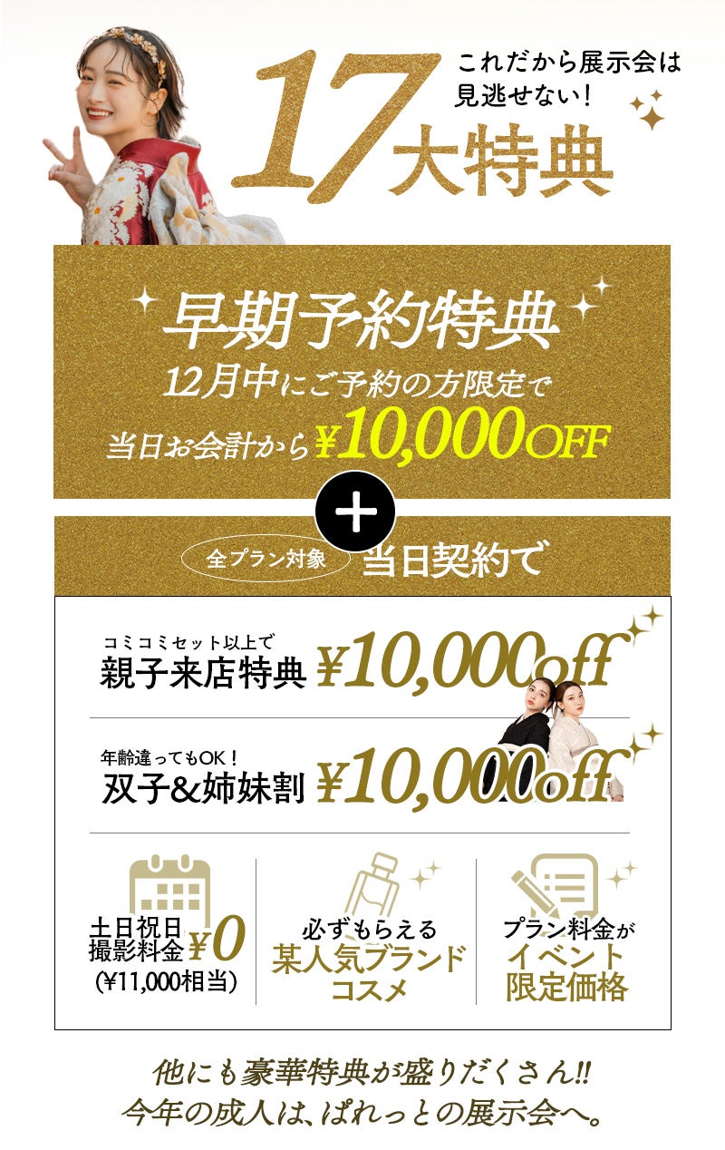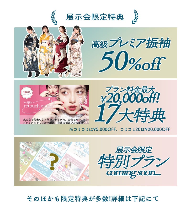 展示会に一歩足を踏み入れた瞬間から、あなたの成人式準備はもっと楽しくなります。今しか受け取れない、夢を叶える豪華な特典をご用意しました。