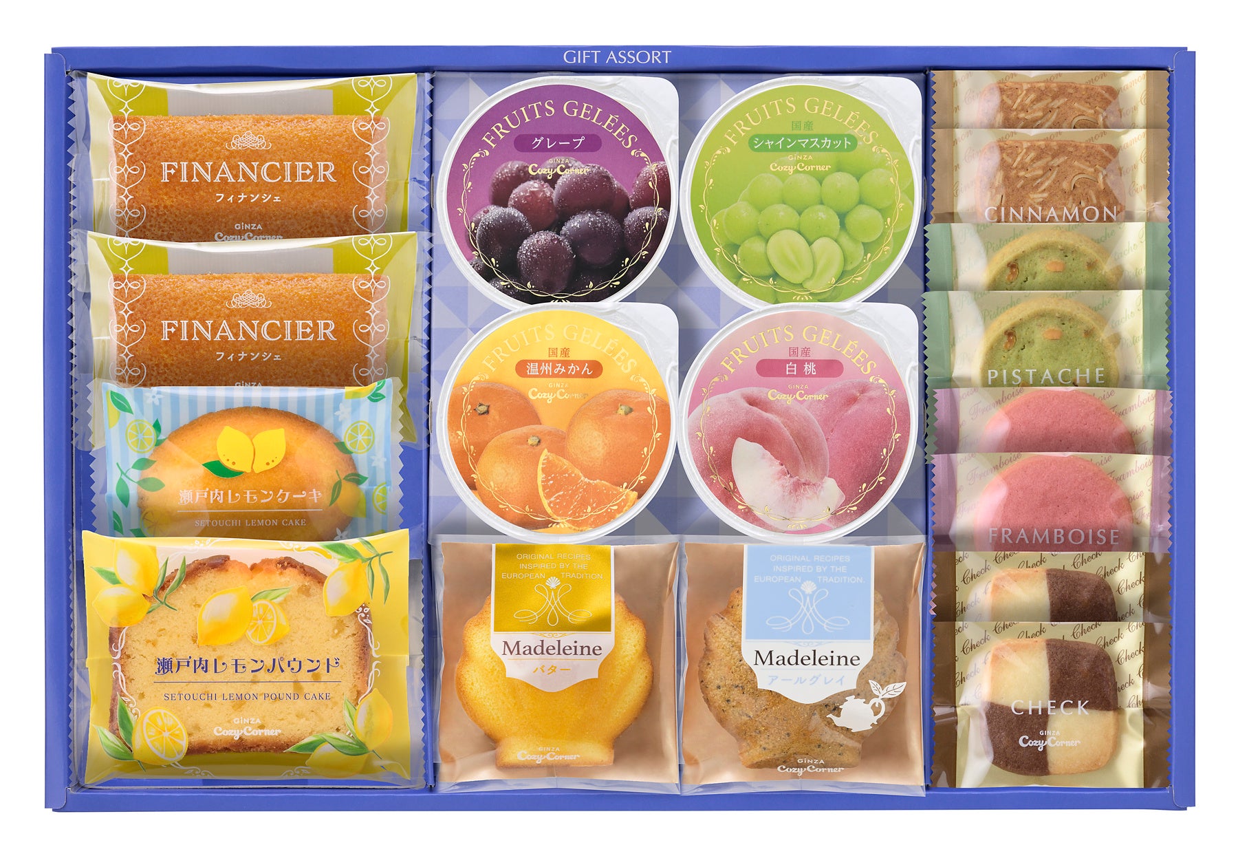 内容:フリュイジュレ(シャインマスカット、温州みかん)各2個、フリュイジュレ(あまおう苺、白桃)各1個、フルーツシャーベット(マスカット)1個、フルーツシャーベット(グレープ)2個、フルーツくずきり(瀬戸内レモン、青森県産ふじりんご、愛媛県産せとか) 各1個、フィナンシェ、瀬戸内レモンケーキ、瀬戸内レモンパウンド 各2個、バターマドレーヌ、アールグレイマドレーヌ 各2個、クッキー(ピスターチ、チェック、フランボワーズ)各2個