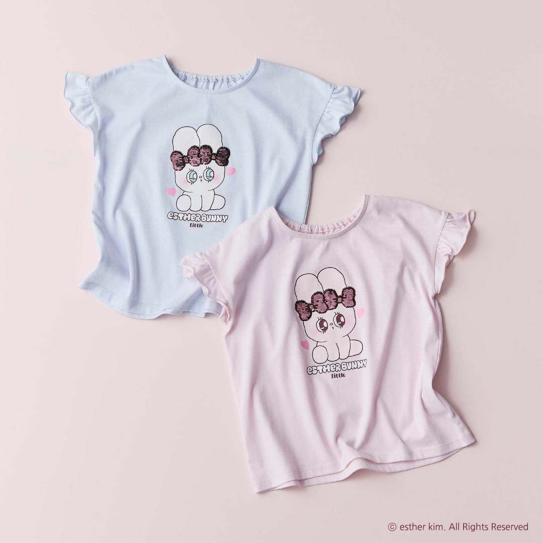 フロントに「エスターバニー リトル」のプリントと色の変わるスパンコール刺繍を施したTシャツ。袖はフリル袖でガーリーな印象に。肌あたりのよい天竺素材で夏まで着られます。