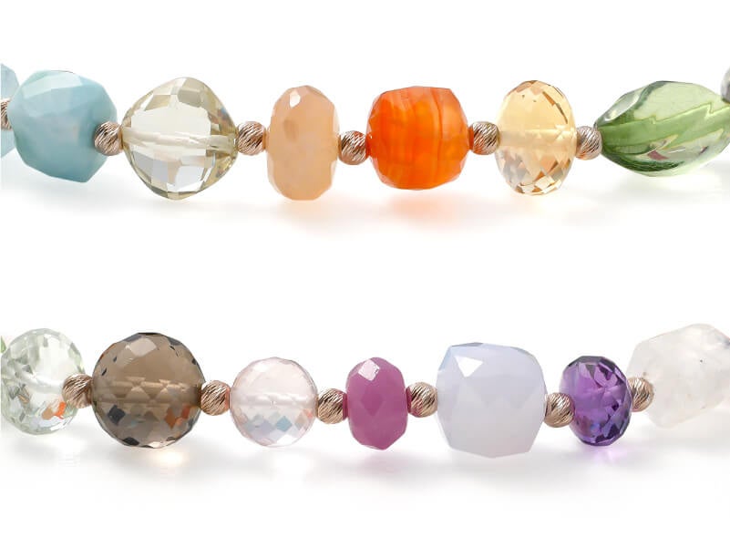 色とりどりの石を1本に紡いだブレスレットには、計21種類の石を使用。