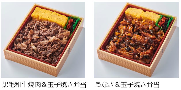 「築地 牛武」では、バラ、ランプ、肩の食感が楽しめる厳選されたA5ランクの国産黒毛和牛焼肉と、出汁からこだわった玉子焼きを楽しめる「黒毛和牛焼肉&玉子焼き弁当」1,900円(税込)、秘伝のタレをたっぷりかけたうなぎとこだわりの玉子焼きの「うなぎ&玉子焼き弁当」1,620円(税込)などをお好みでご賞味いただけるよう取り揃えました。