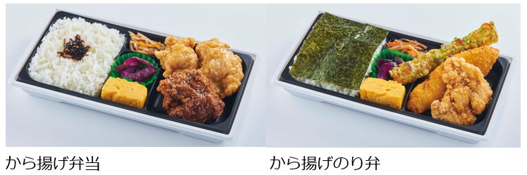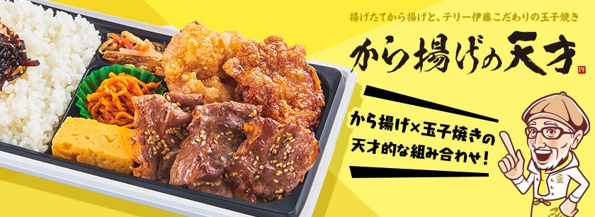 「から揚げの天才」では、テリー伊藤こだわりの「玉子焼き」と人気のから揚げ「デカから」を楽しめるボリューム満点「から揚げ弁当」950円(税込)やテイクアウトで人気の「から揚げのり弁」950円(税込)など豊富なラインナップを取り揃えております。