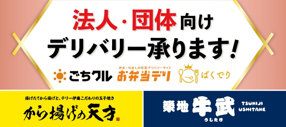 揚げたてから揚げとテリー伊藤こだわりの玉子焼き「から揚げの天才」と「築地 牛武」は、法人・団体向けデリバリーサービスをECサイト「ごちクル」「弁当・仕出しの宅配デリバリーサイト お弁当デリ」「ぱくでり」にて、関東エリア限定でお弁当の受注配送サービスを2024年9月1日より開始いたしました。