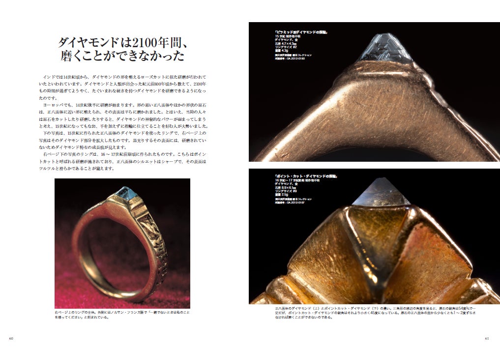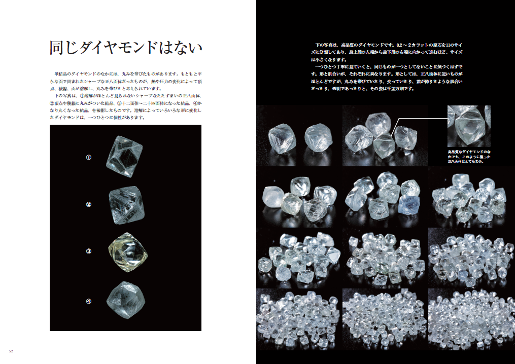 アンカットダイヤモンドの特質を、産地(アンゴラ・ブラジル・ロシア)の特徴、サイズ、様々な形や模様、特徴的なトライゴン、蛍光性、個体の個性に分けて、それぞれ豊富な写真で紹介しています。