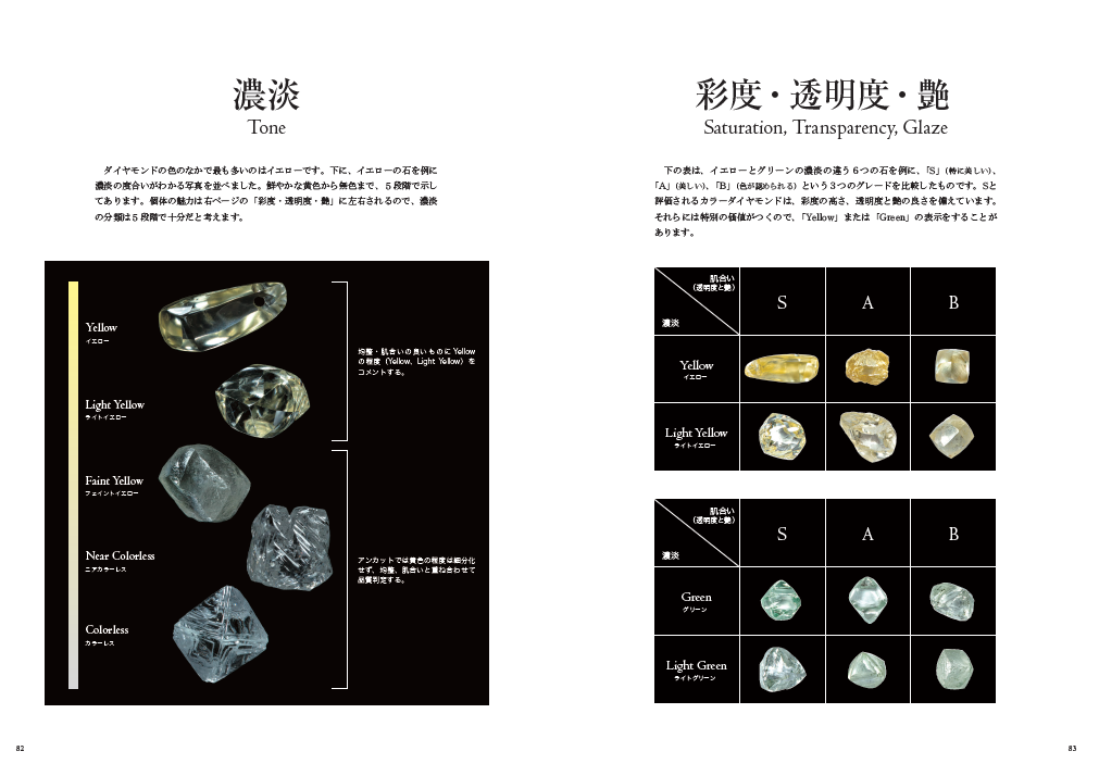 そして今、アンカットダイヤモンドには、研磨してしまうには惜しい、魅力的なダイヤモンドがあることを広く知ってほしいと、著者、諏訪恭一氏が宝飾の専門家としての長年の知見を基に、クオリティスケール・品質の3ゾーン・色相など、判断の基準を掲載、提案しています。