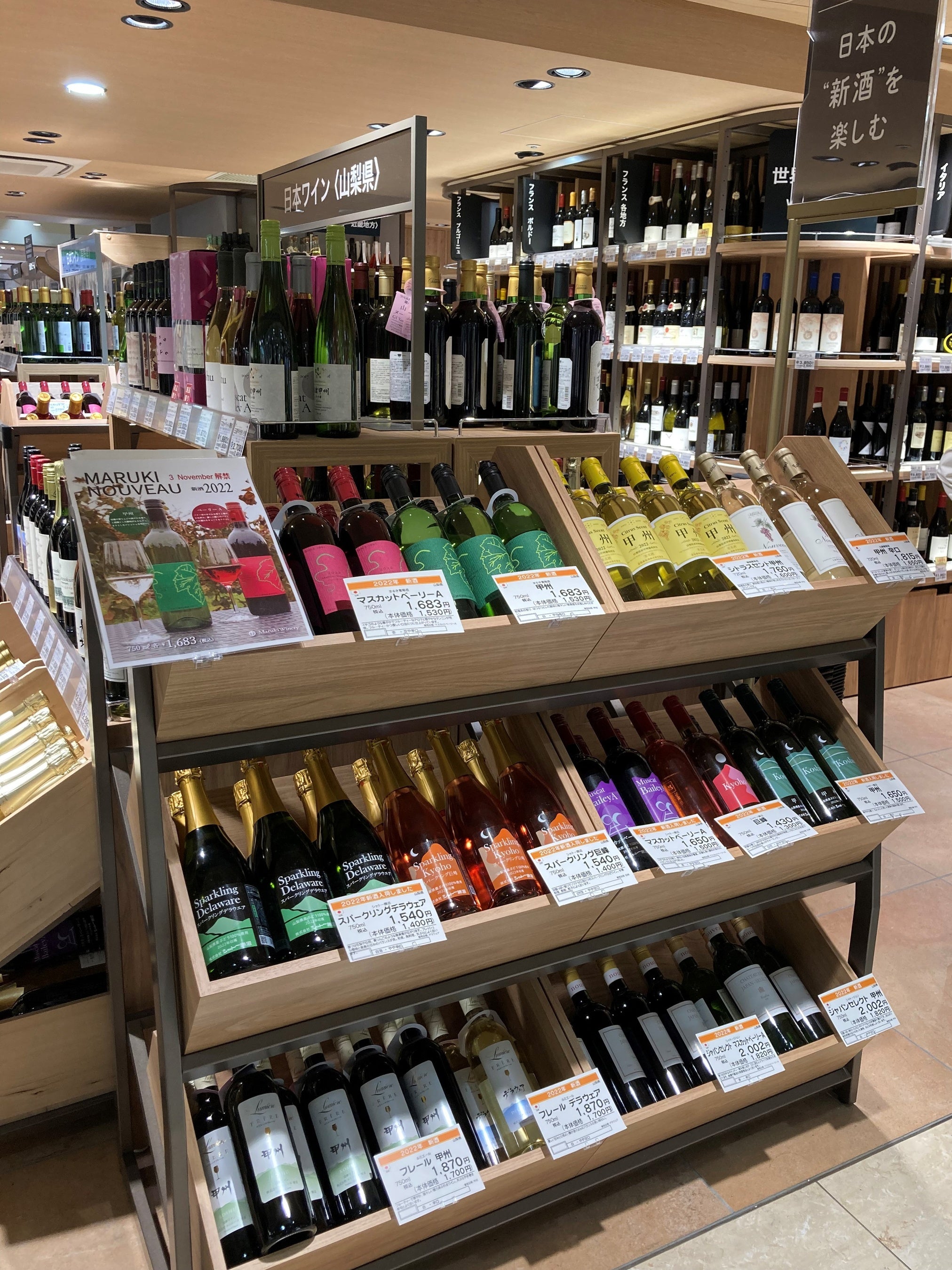 2022年4月にリニューアルした和洋酒売場での初めてのボージョレ・ヌーヴォー解禁ということもあり、今年もお客様にご満足いただけるよう接客に磨きをかけ、準備は万端。また、11月3日(木)解禁された山梨ヌーヴォーをはじめ今年大注目の日本ワインの新酒も30種類以上ご用意!