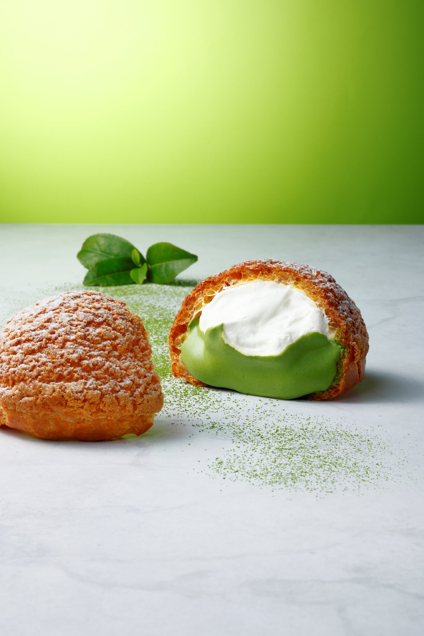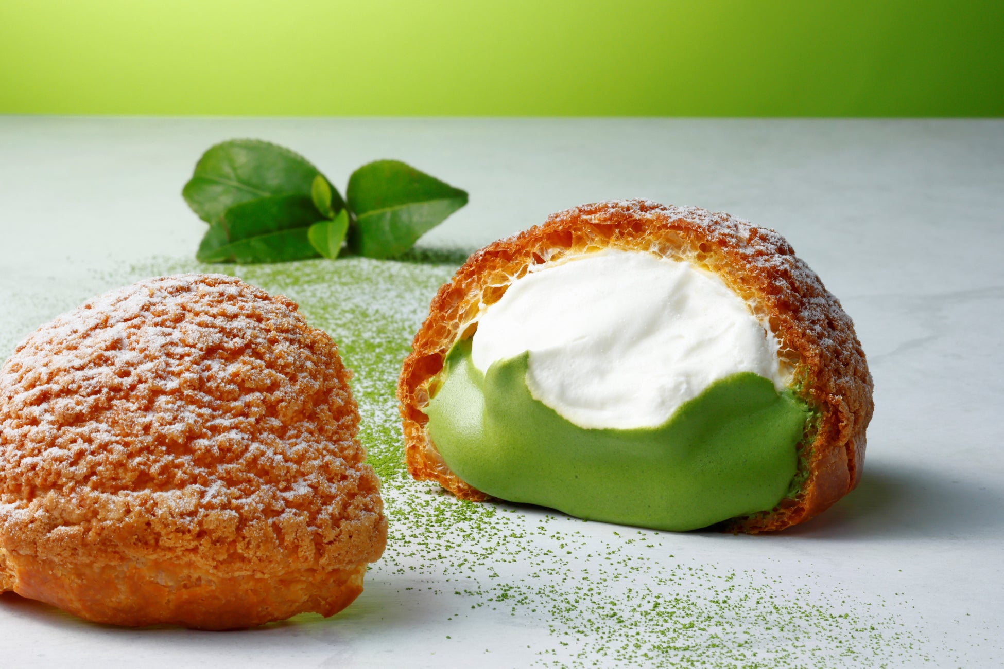 カマンベールチーズクッキーをのせて焼き上げたシュー⽣地に、“宇治抹茶クリーム”と“北海道ミルククリーム”の2種類のクリームを詰めました。“宇治抹茶クリーム”は、抹茶香るほんのりとした苦みが特長。“北海道ミルククリーム”は、マスカルポーネチーズ、生クリーム、練乳で仕立て、まろやかな味わいに仕上げました。
