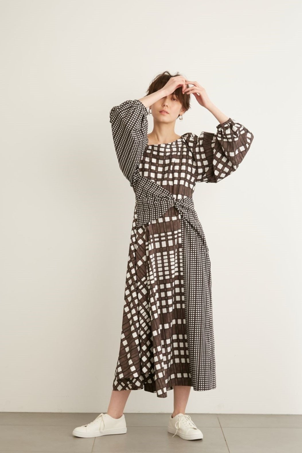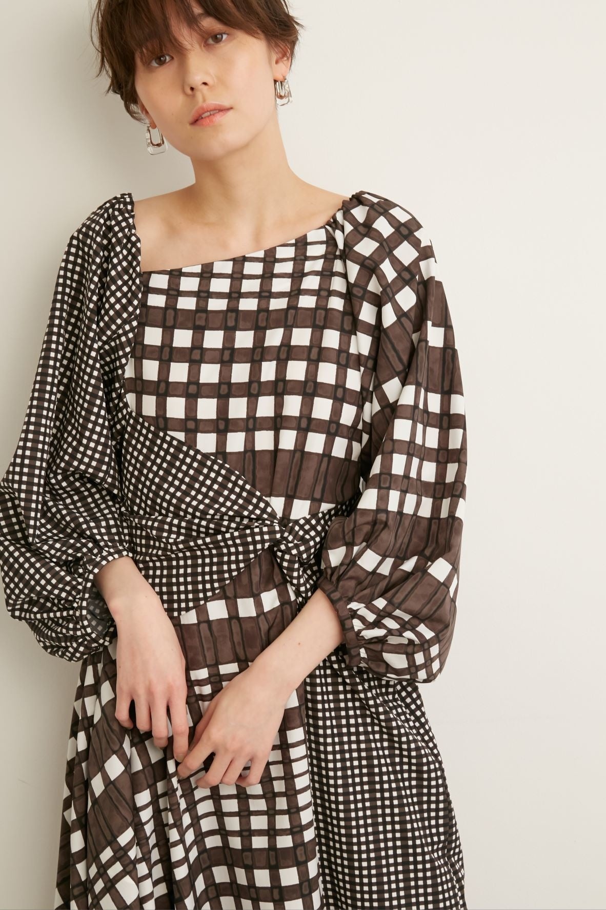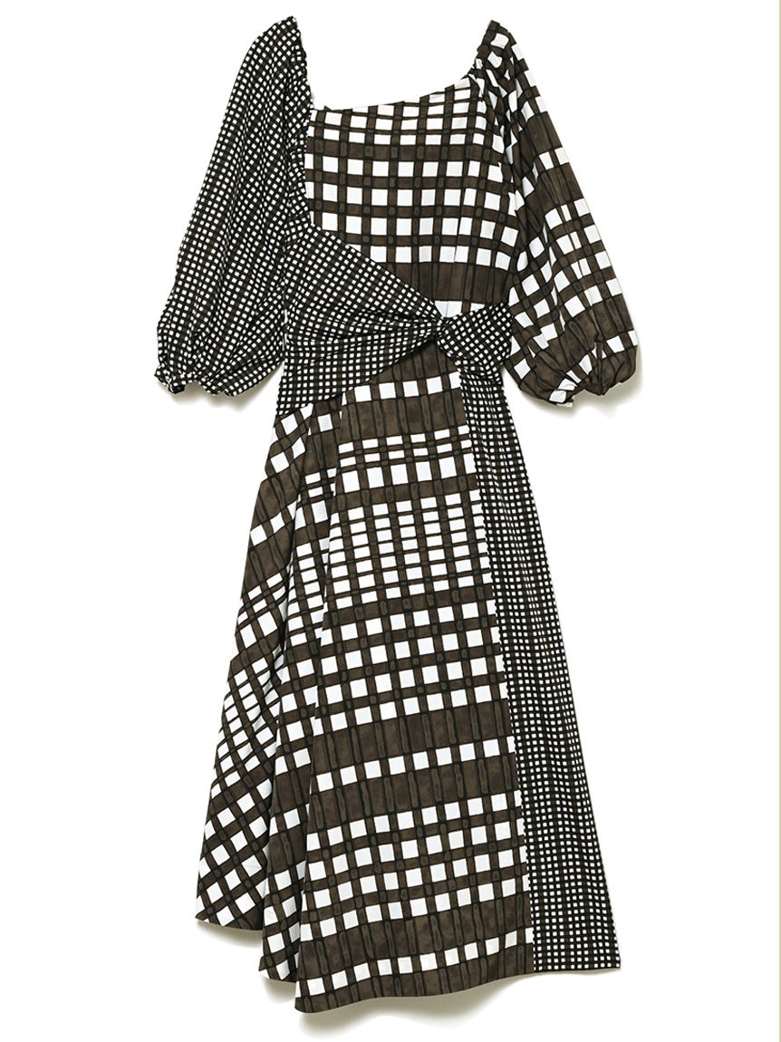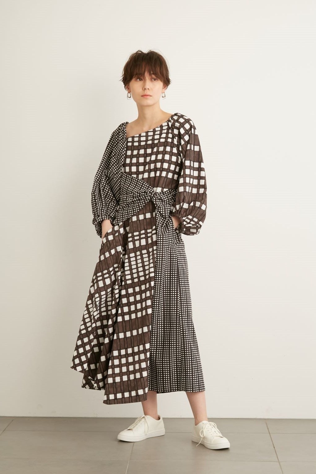 今年の春トレンドのチェック柄。手書きタッチの温かみのあるチェック柄をemmiファブリックの素材に落とし込みました。デコルテラインを綺麗に見せてくれるアシンメトリーなオフショルは大人も着やすい胸元ラインに設計しています。ウエストは絞りを加えているのでスタイルアップ効果が期待。スカート部分は左サイドはストレートラインに、右サイドはフレアラインになるようにドレープを加え、アシンメトリーをアレンジしています。
