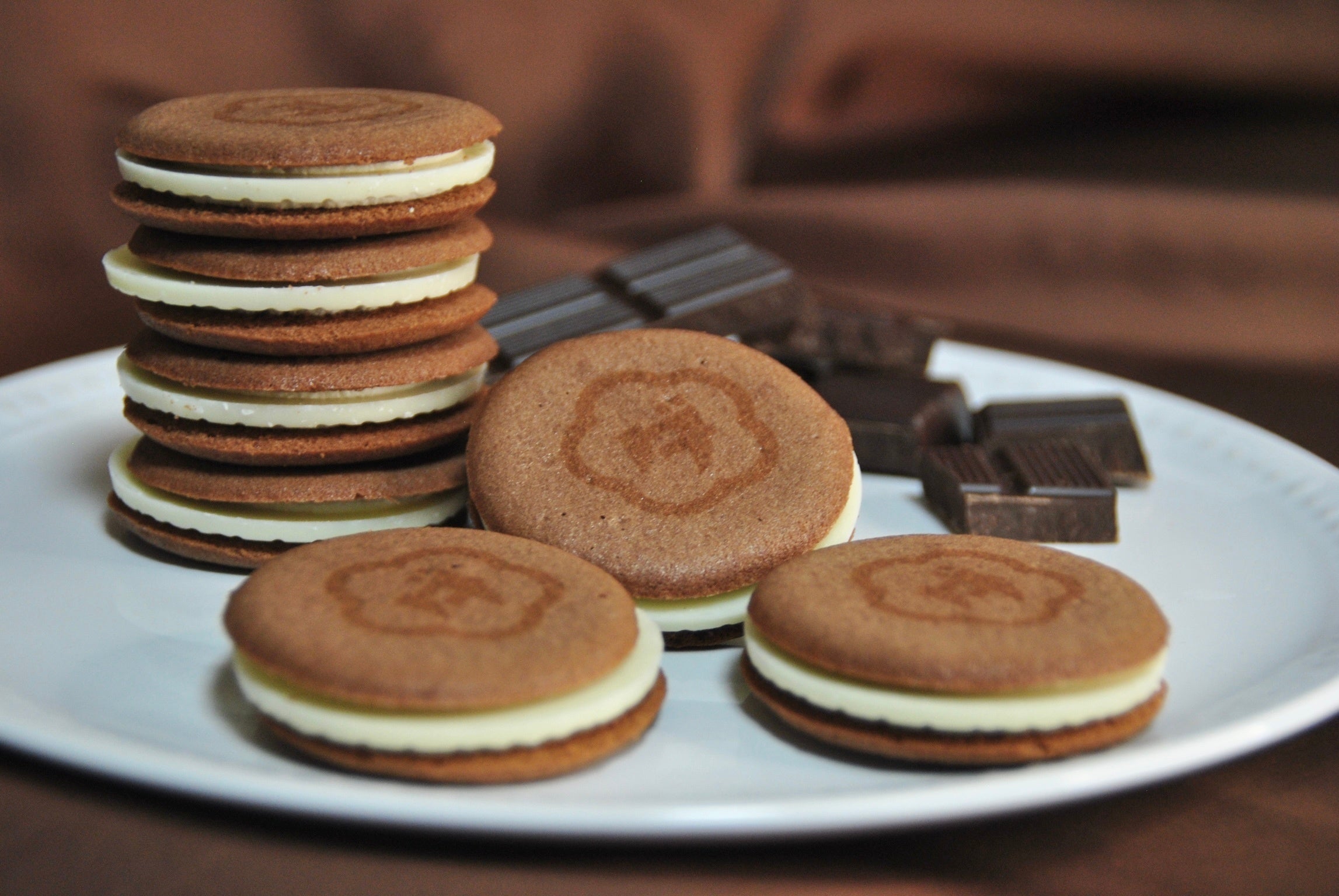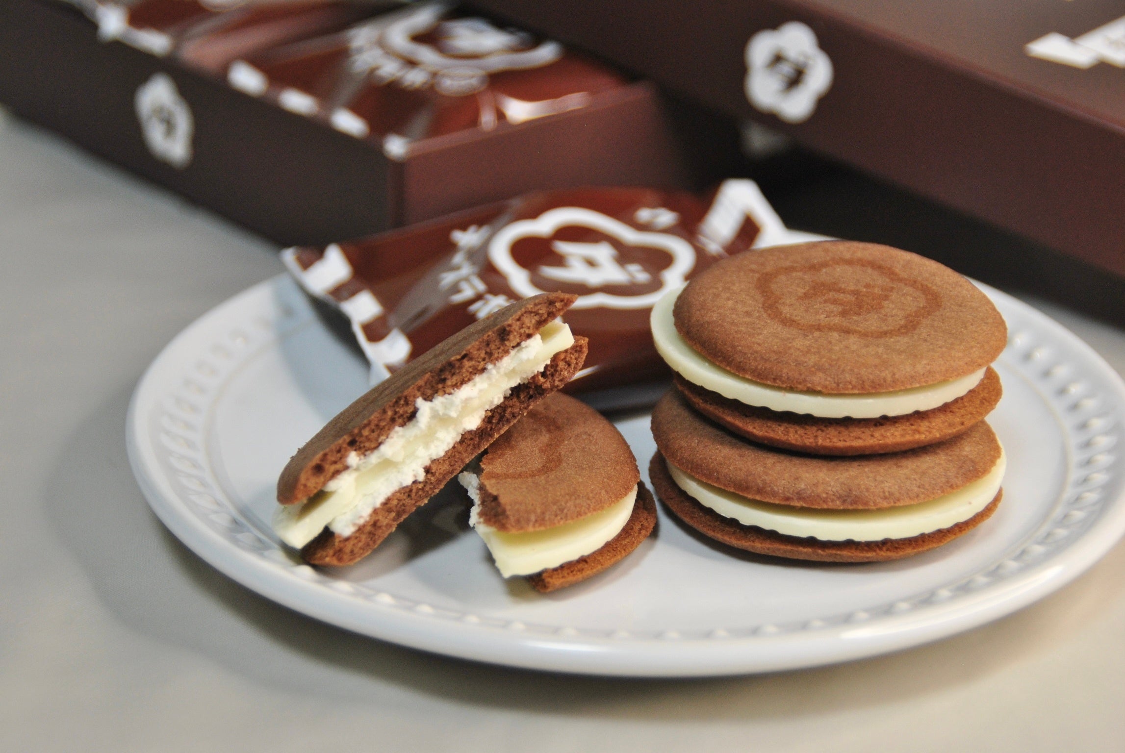 ココアパウダーを加えて焼き上げたクッキーで、ホワイトチョコレートとチーズクリームをサンドしています。