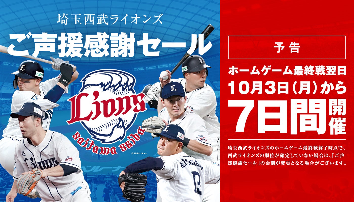 そごう・西武は、ファンのみなさまと共に、埼玉西武ライオンズを応援してまいりました。1年間の皆さまのご声援にお応えするとともに、チームのますますの活躍を祈念して、10月3日(月)より7日間、ご声援感謝セールを開催いたします。