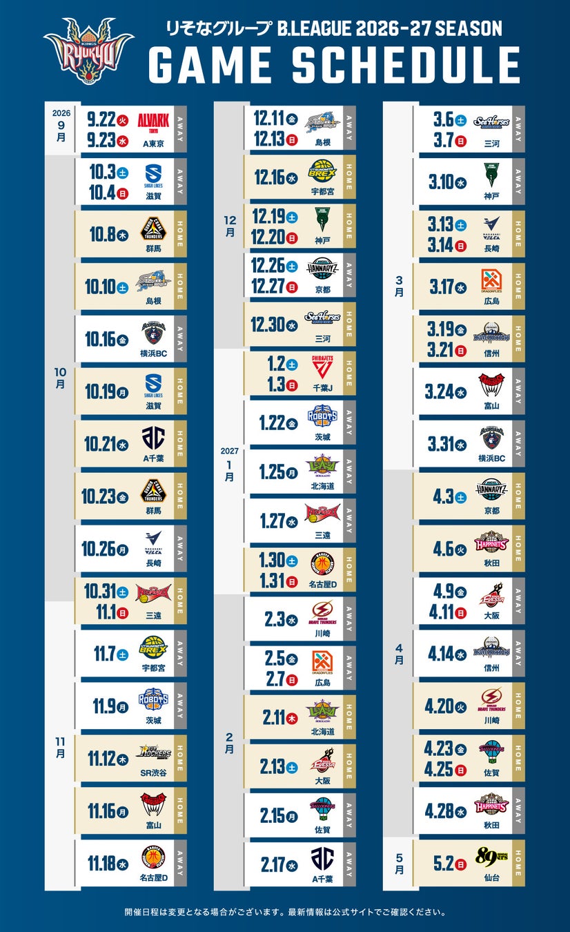 2月17日(火)にBリーグより発表がありました通り、「りそなグループ B.LEAGUE 2026-27 SEASON」全60試合の対戦カードが決定しましたのでお知らせいたします。