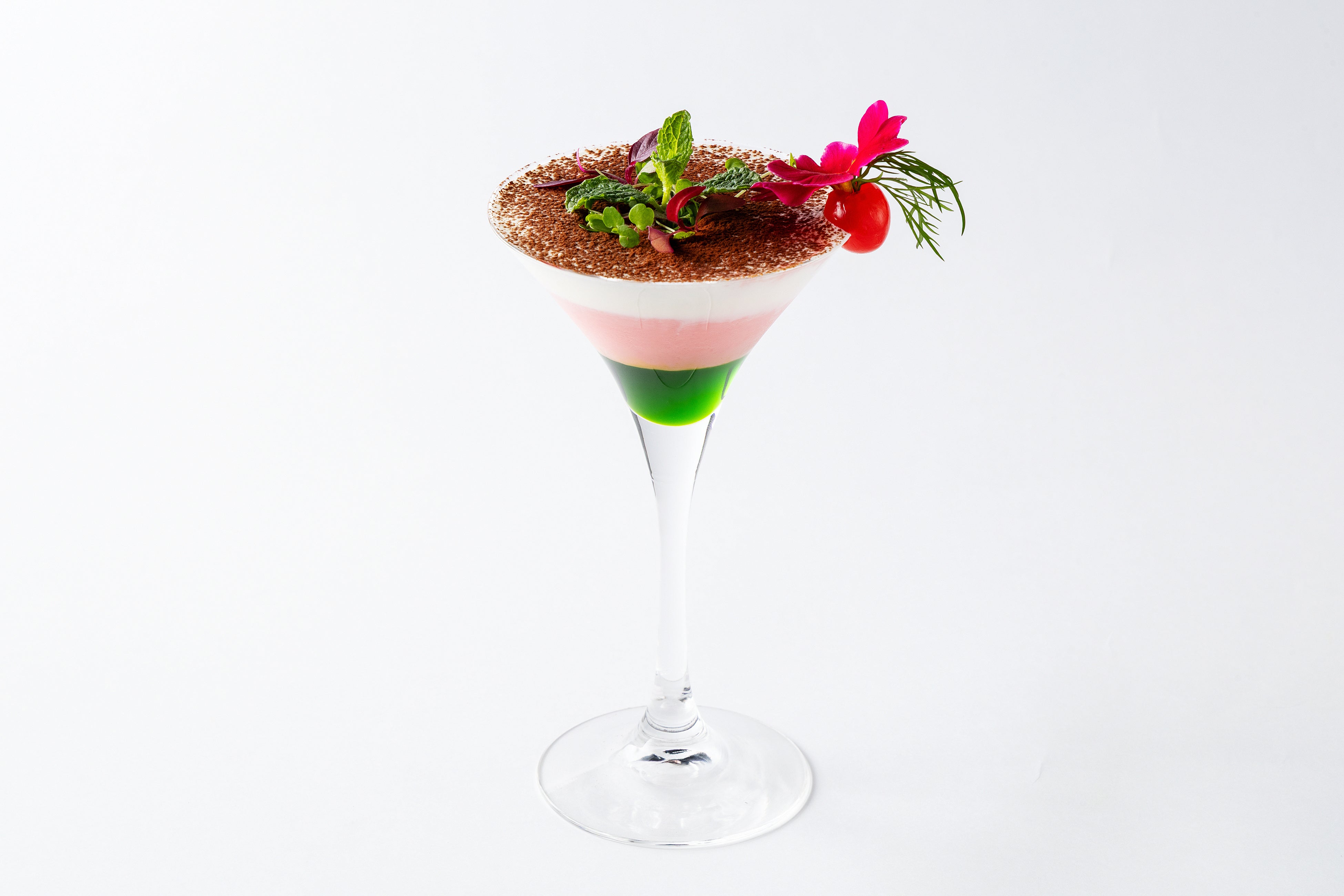 抹茶の緑、苺の赤、クリームの白の三層は、芽吹き・葛藤と成長・そして現在を表しています。15年の月日が積み重なり、やがて豊かな土壌となる。その大地から、新たな芽吹きが生まれることを表現したデザートカクテルです。
