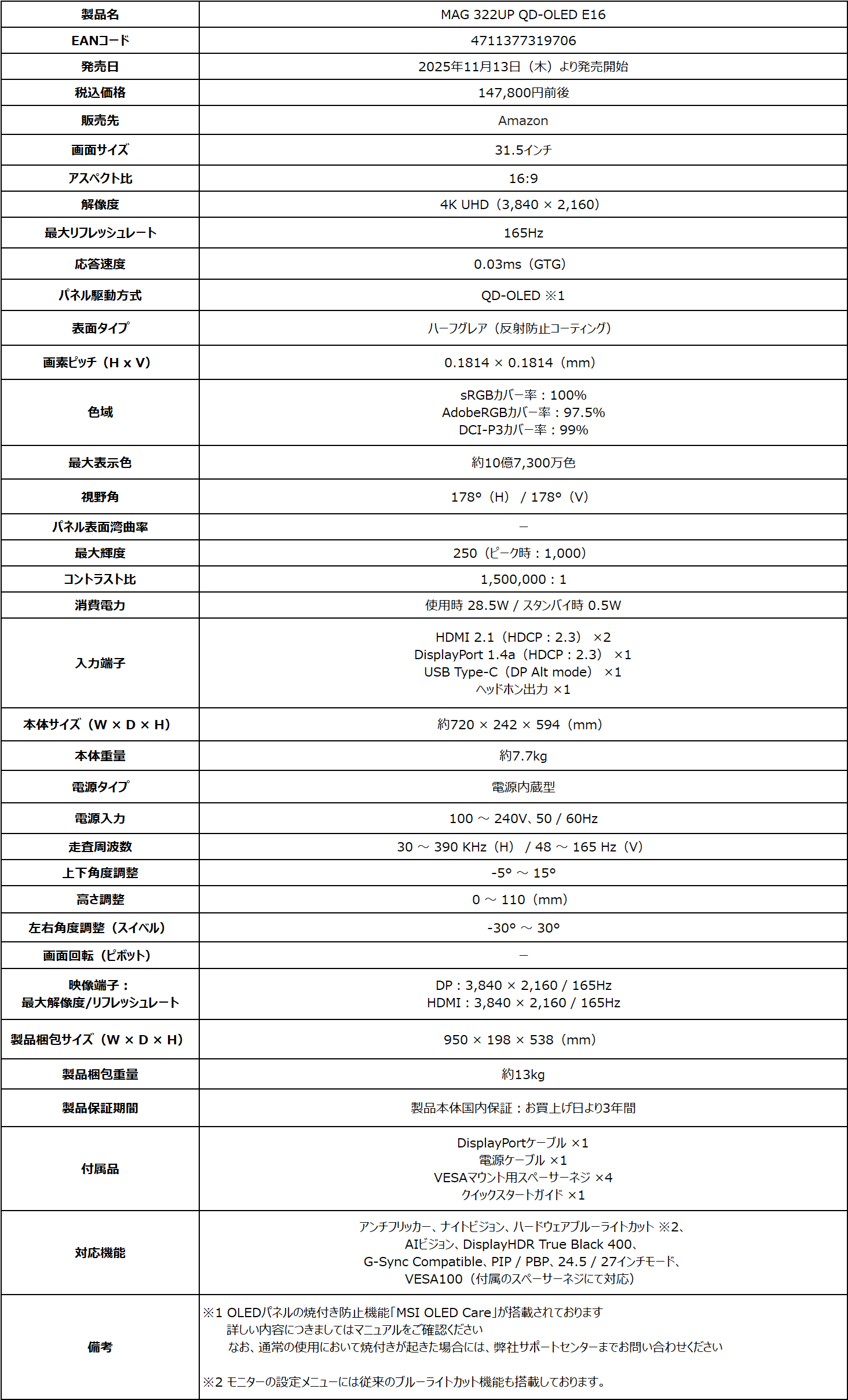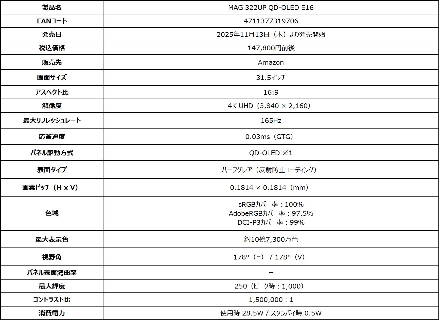 有機EL × 量子ドットパネル採用で次世代の映像美を体感 4K UHD / 160Hz / 0.03msの高いゲーミング性能 「MAG 322UP QD-OLED E16」発売