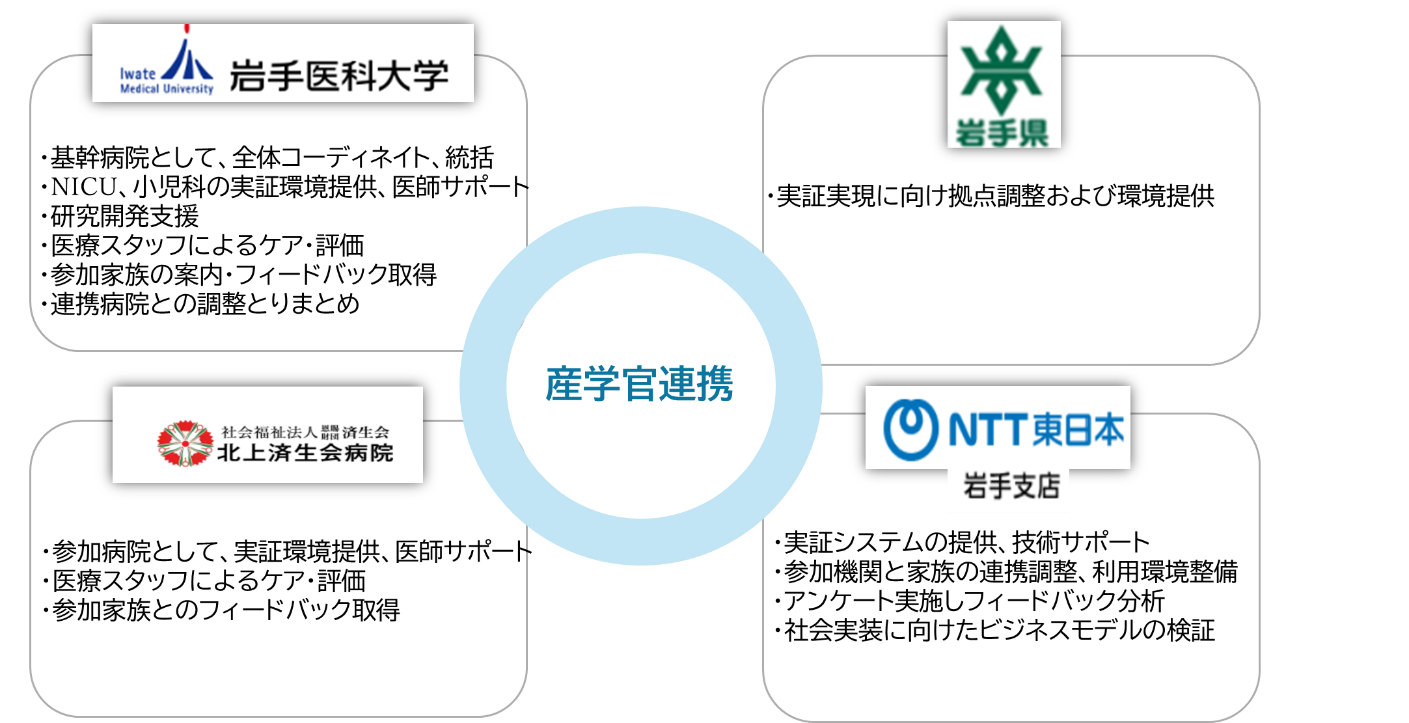 本実証「愛のカタチ」では、映像や音声に加えて触覚情報を伝送するシステム(3)をNICUに導入することで、広い県土・積雪などの地理的条件から面会困難となる岩手県の社会課題解決、さらに家族愛を高めるウェルビーイング向上にも資することを目的として、NTT東日本がNTT社会情報研究所との共同実験のもと、岩手医科大学、北上済生会病院、岩手県と連携して行うものです。