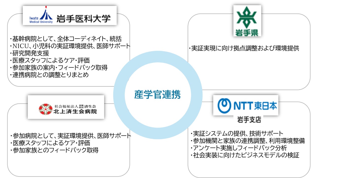 NTT東日本株式会社 岩手支店(支店長:後藤 高宏、以下「NTT東日本」)、学校法人岩手医科大学(理事長:祖父江 憲治、以下「岩手医科大学」)、北上済生会病院(病院長:福島 明宗)、岩手県(知事:達増 拓也)は、新生児集中治療室(Neonatal Intensive Care Unit : NICU)に入院する赤ちゃんと、院内の別室または自宅・職場など遠隔地にいるご家族をつなぐ遠隔実証「愛のカタチ」を開始します。
