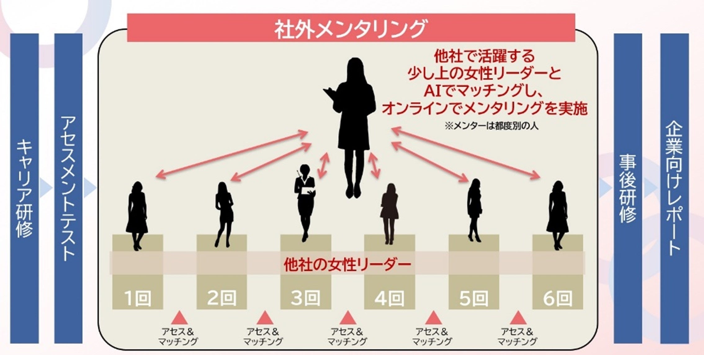 「withbatons」は、2024年6月にスタートした新事業で、管理職候補となる女性社員をメインターゲット、新しい形の企業向けキャリア形成支援サービスです。「キャリア研修」「アセスメントテスト」「社外メンタリング」「企業向けレポート」がセットになったプログラムで構成され、中心となる社外メンタリングにおいてはアセスメント結果からAIでマッチングされた異なる経歴を持つ6名の女性メンターと1対1で対話を重ねます。メンターは、現役で正社員として他社で働いている女性リーダー達であり、プロメンターやキャリアコンサルタントとは異なる「女性リーダーのリアルなキャリアストーリー」を多く聞くことができます。さまざまな経験・バックグラウンドをもつ現役女性リーダーであるメンターとの6回の対話を通じて、女性社員自身が自らのキャリアにおける軸を見つけることを支援します。事業開始から3カ月で、既にメンティーの管理職意向に変化が表れています。6月の開始時点では、管理職への意向がポジティブだった方は27%でしたが、3回目のメンタリング完了時には71%に増加しており、企業の人的資本経営・女性活躍推進に資するサービスとなっております。