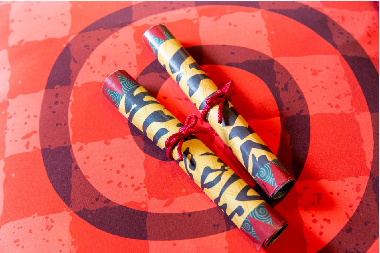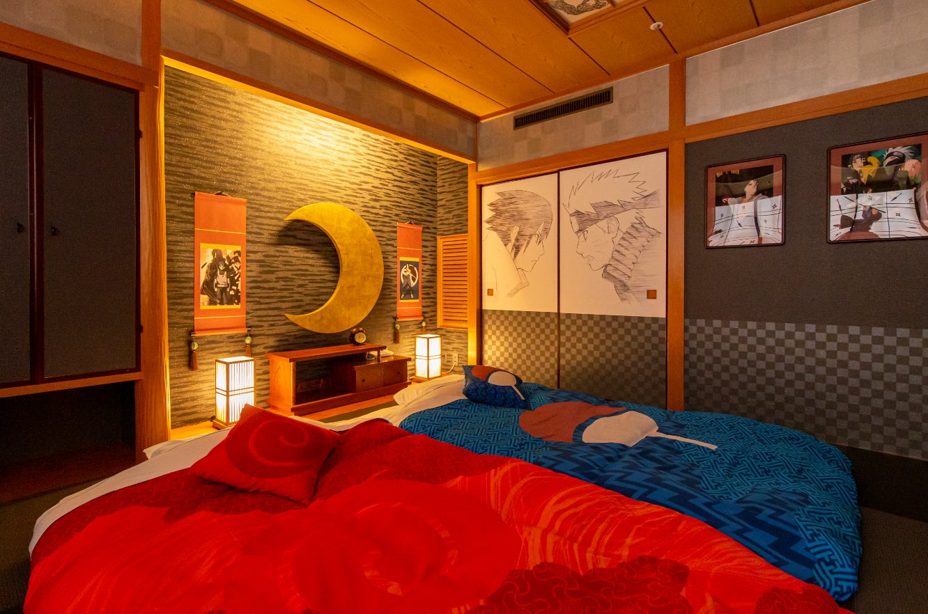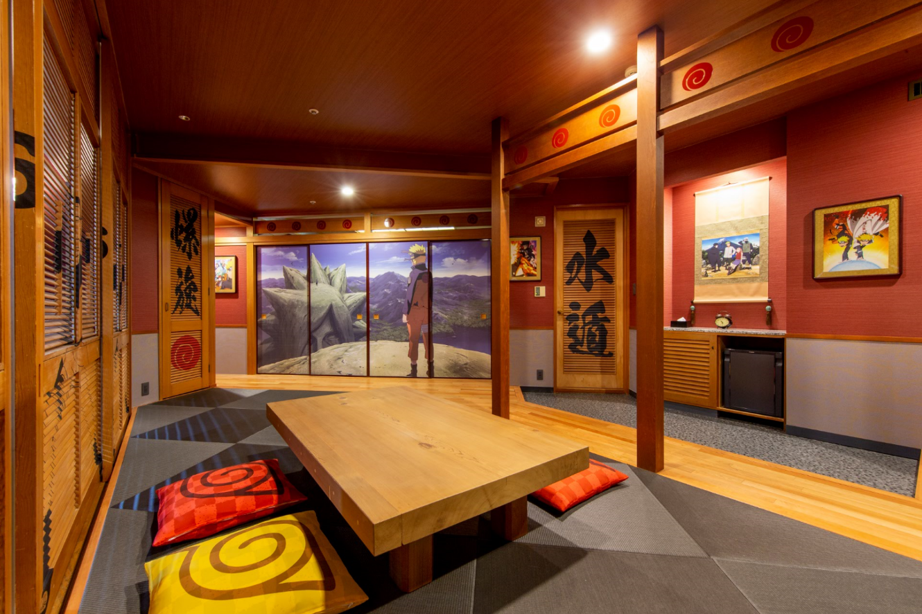 「NARUTO-ナルト- 疾風伝」の世界観を再現した特別和室。客室は“陽ノ間”と“陰ノ間”で構成されており、チェックイン時に受け取る「修業ノ書」に書かれた試練を乗り越えながら宿泊修業に臨みます。
