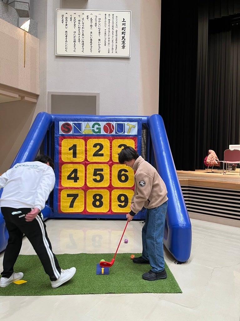ゴルフアパレルブランド「Jack Bunny!!」のコーナーでは初めてゴルフを体験する子どもたちがスタッフからの丁寧な指導を受けながら、次から次へとスナッグゴルフとミニパターに挑戦。スナッグゴルフで数字の的に向けてボールを飛ばし、見事、ビンゴを成立させるか、ミニパターゴルフで真ん中のゴールに入ったら賞品がもらえるというスペシャル体験会に皆、夢中に挑んでいました。 また、「Jack」くんによる「ジャックくんたいそう」には、西木上川町長はじめ会場中の人々が全員参加し、音楽に合わせて一緒に体操をする体験会も開催。子どもも大人も溢れる笑顔で、楽しみながら身体を動かしていました。終了後には、参加者全員でステージに上がり、「Jack」くんと記念撮影を行いました。