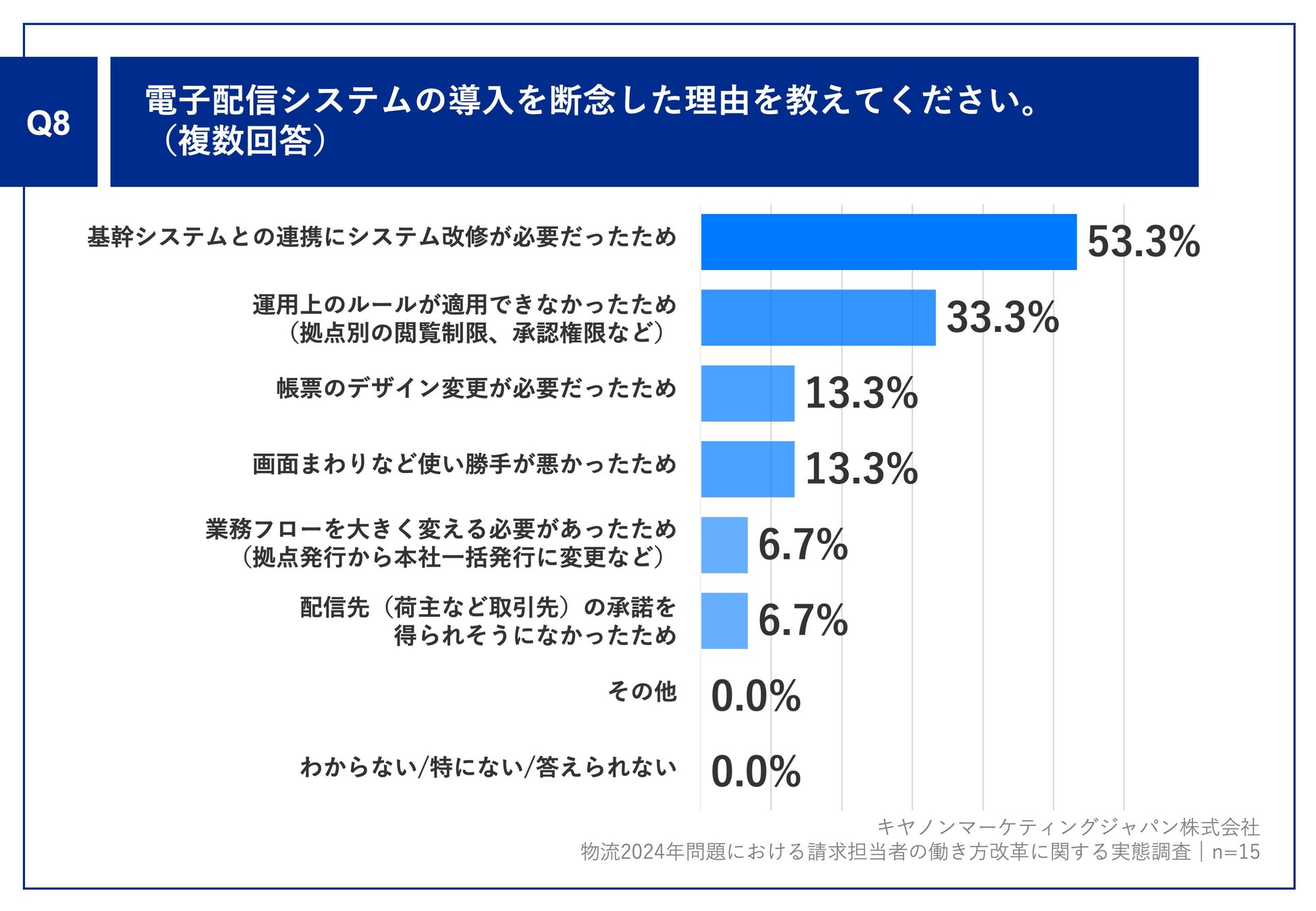 Q7で「過去に検討したが導入を断念した」と回答した方に、「Q8.電子配信システムの導入を断念した理由を教えてください。(複数回答)」と質問したところ、「基幹システムとの連携にシステム改修が必要だったため」が53.3%、「運用上のルールが適用できなかったため(拠点別の閲覧制限、承認権限など)」が33.3%という回答となりました。