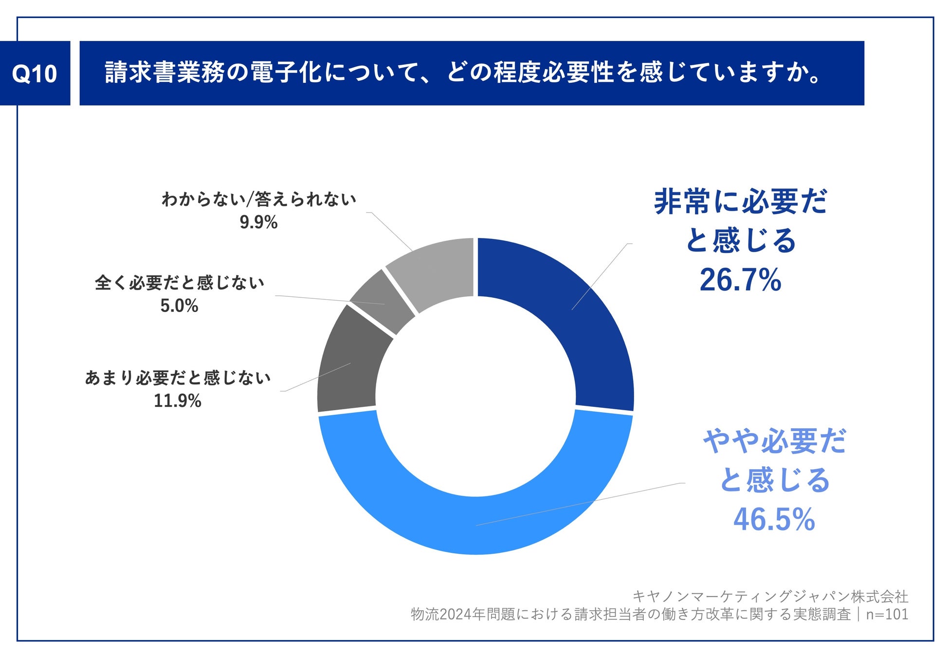「Q10.請求書業務の電子化について、どの程度必要性を感じていますか。」と質問したところ、「非常に必要だと感じる」が26.7%、「やや必要だと感じる」が46.5%という回答となりました。
