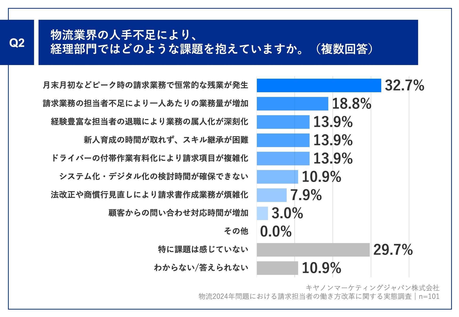 「Q2.物流業界の人手不足により、経理部門ではどのような課題を抱えていますか。(複数回答)」と質問したところ、「月末月初などピーク時の請求業務で恒常的な残業が発生」が32.7%、「請求業務の担当者不足により一人あたりの業務量が増加」が18.8%という回答となりました。